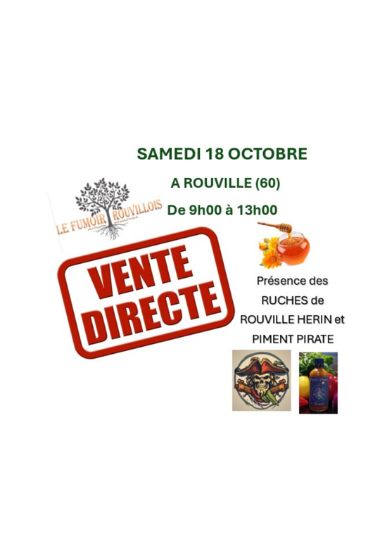 Une VENTE DIRECTE à Rouville le samedi 18 octobre de 9h à 13h. Seront présents avec le Fumoir Rouvillois, les Ruchés de Rouville Hérin avec un miel 100% local et Piment Pirate @pimentpirate qui vous proposera ses sauces pimentées 🌶. A très bientôt.