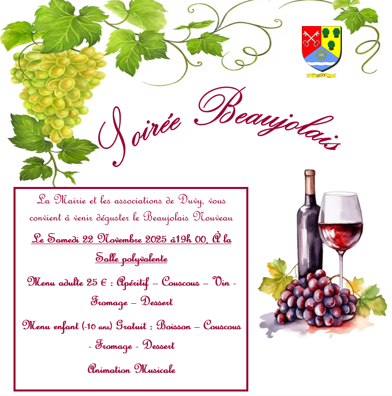La Mairie et les associations de Duvy, vous convient à venir déguster le Beaujolais Nouveau !
