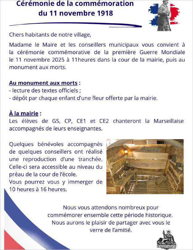 le 11 novembre, à 11h dans la cour de la mairie puis au monument aux morts