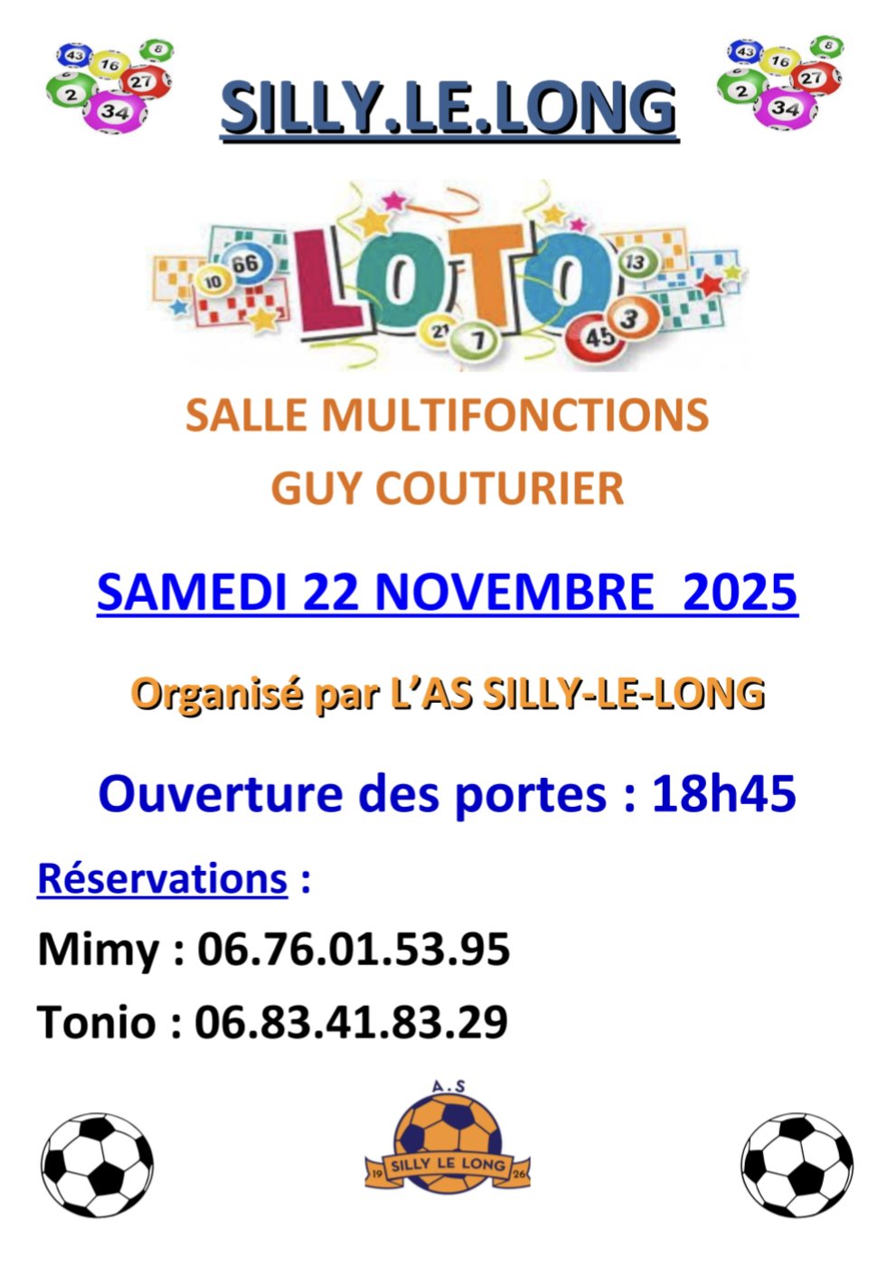 Venez passer un moment festif lors du loto organisé par l'AS Silly-le-Long De nombreux lots à gagner Ouverture des portes à 18h45 Réservations et renseignements : Mimy : 06.76.01.53.95. Tonio : 06.83.41.83.29.