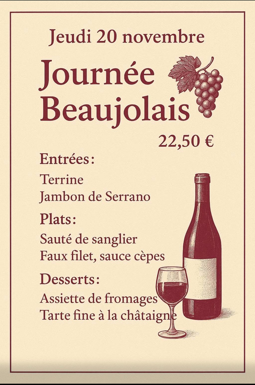 Venez dĂ©guster un menu crĂ©e spĂ©cialement pour fĂȘter l'arrivĂ©e du Beaujolais nouveau đŸ· !