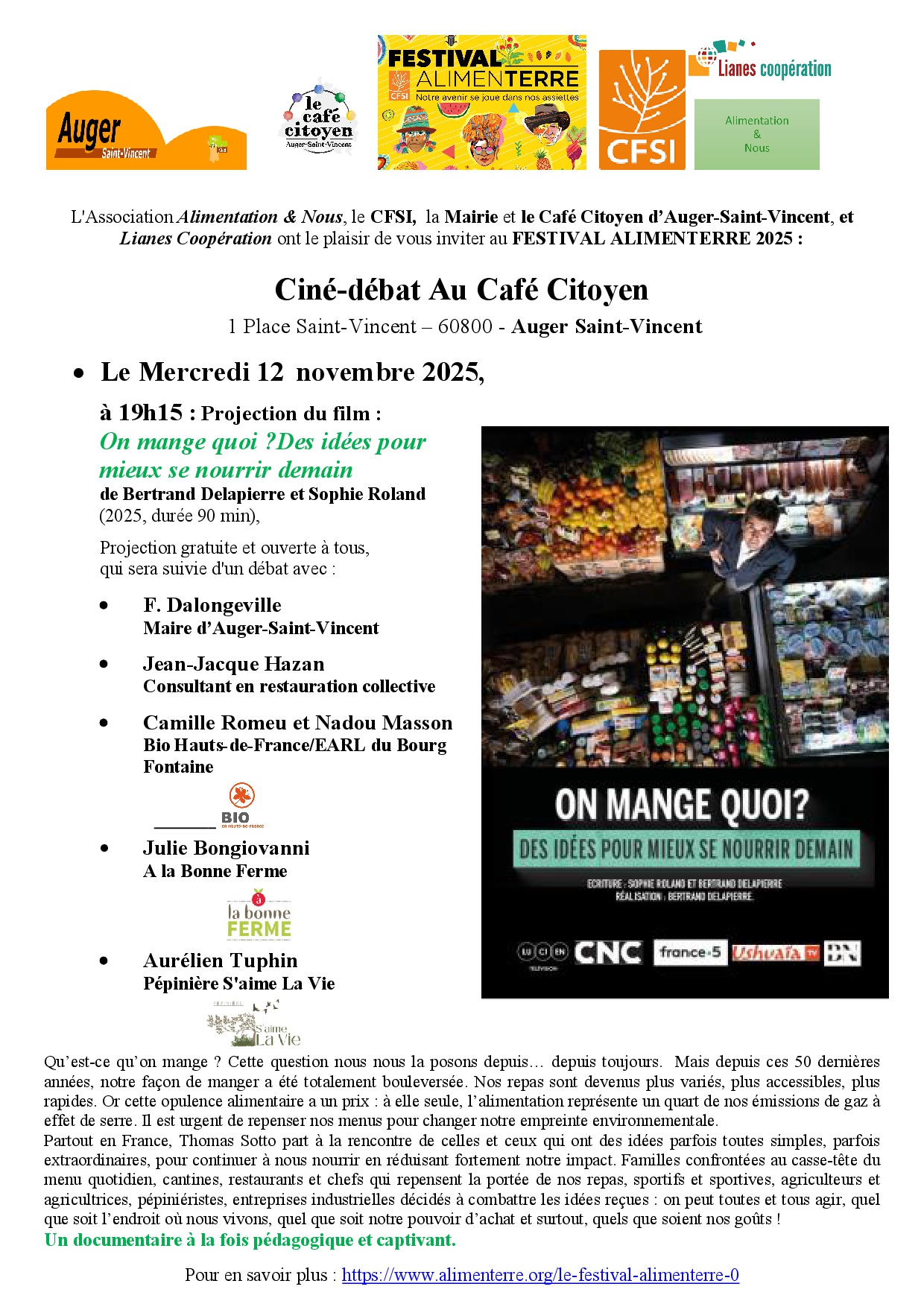 La projection sera suivie d'un débat avec : F. Dalongeville (Maire d’Auger-Saint-Vincent), Jean-Jacques Hazan (Consultant en restauration collective), Camille Romeu (Bio Hauts-de-France) et Nadou Masson (Bio Hauts-de-France/Ferme du Boug Fontaine), Julie Bongiovanni (A la Bonne Ferme), Aurélien Tuphin (S’aime la Vie)