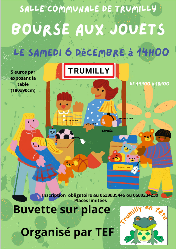 Bourse aux jouets à Trumilly De 14h à 18h Exposants : 5€ la table (180 x 90 cm) Inscription obligatoire au 06.29.83.94.46. ou 06.09.23.42.39 Places limitées Buvette sur place Organisé par TEF
