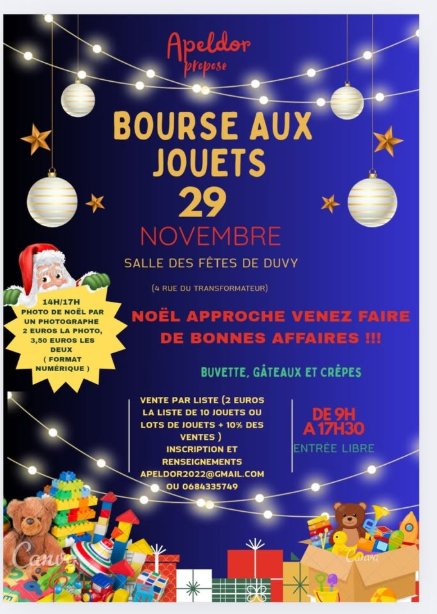 Noël approche, venez faire de bonnes affaires !! Rendez-vous le 29 novembre à la salle des fêtes de Duvy de 9h à 17h30 Buvette sur place, gâteaux et crêpes Inscription et renseignements : apeldor2022@gmail.com 06.84.33.57.49.