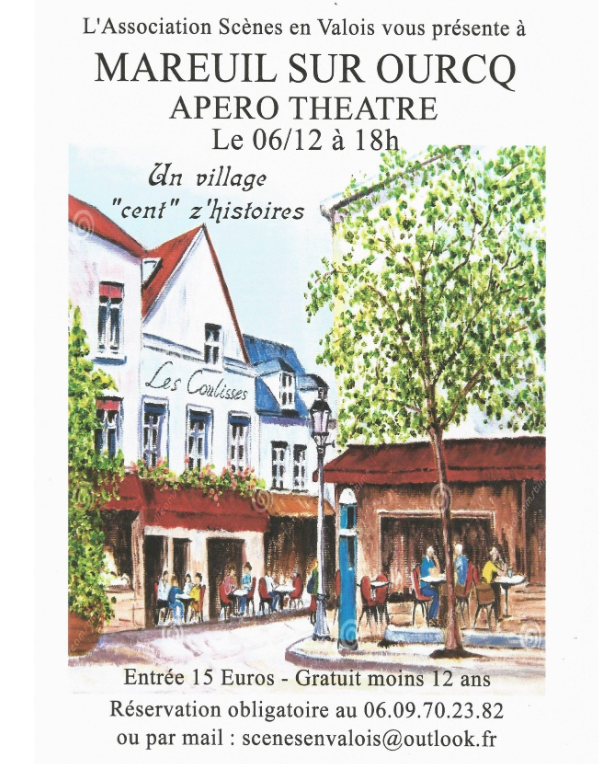 L'association Scènes en Valois présente : Un village "cent" z'histoires 🎭 Apéro Théâtre 📅 Samedi 6 décembre 🕕 18h 📍 Mareuil sur Ourcq 💶 15€ / gratuit moins de 12 ans 🎩 Réservation obligatoire au 06.09.70.23.82. ou scenesenvalois@outlook.fr