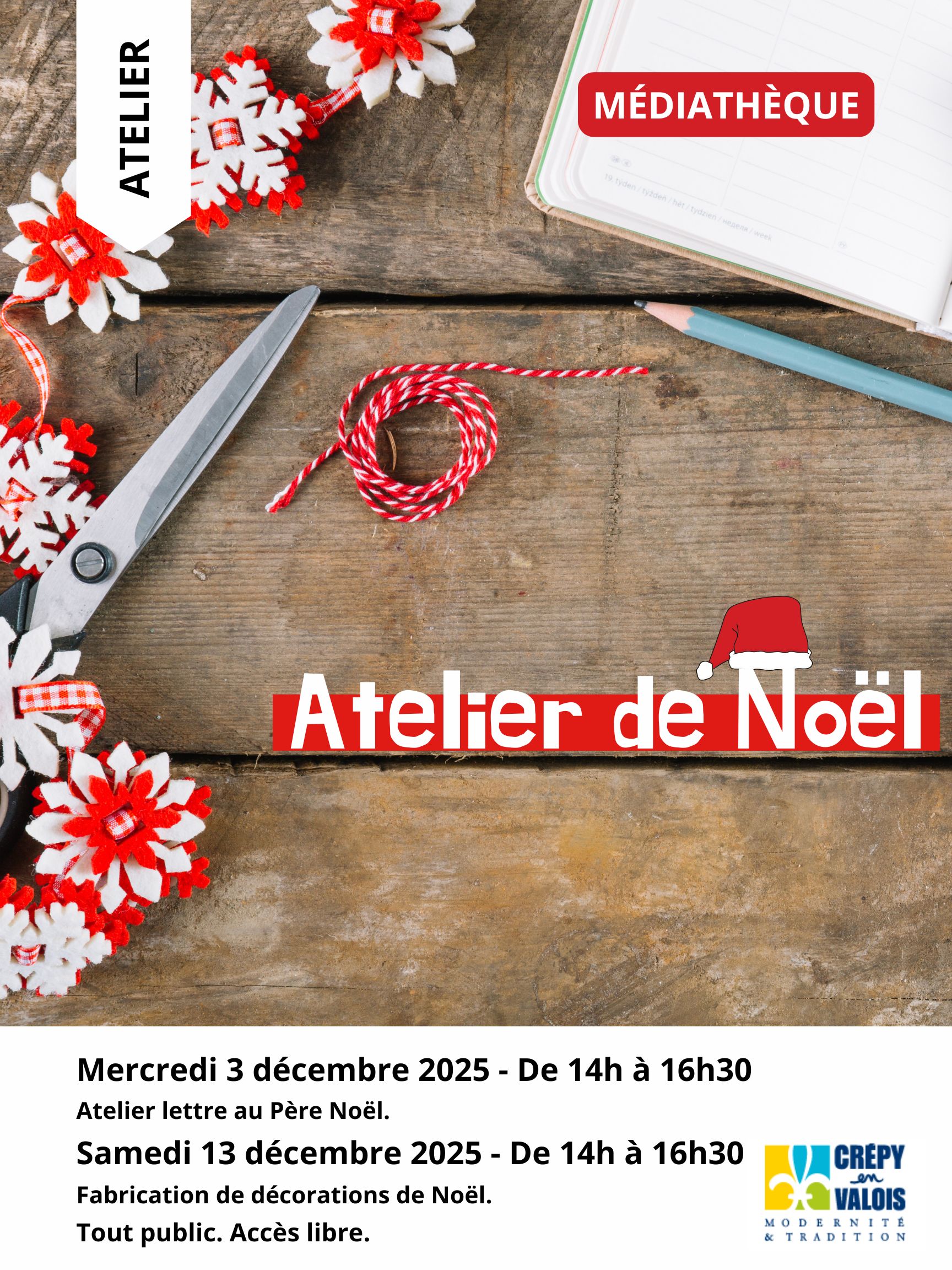 🎅 Atelier "Lettre au Père Noël" 📅 Mercredi 3 décembre 🕑 de 14h à 16h30 🎄 Atelier "Fabrication de décorations de Noël" 📅 Samedi 13 décembre 🕑 de 14h à 16h30 Accès libre - Tout public