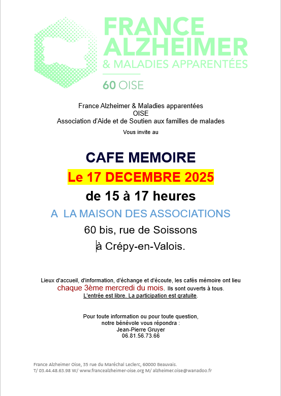 Lieux d'accueil, d'information, d'échange et d'écoute, les cafés mémoire ont lieu chaque 3ème mercredi du mois.