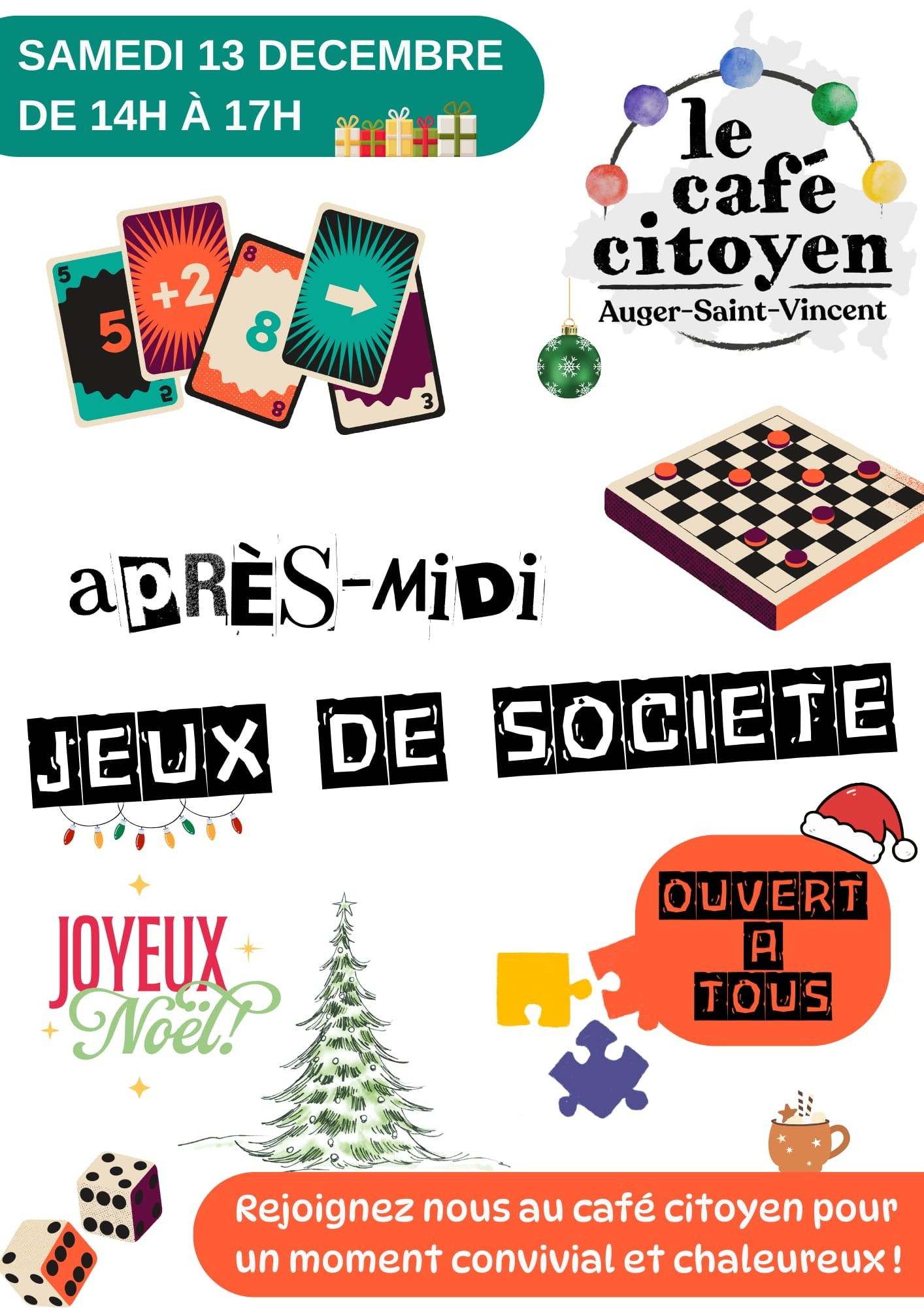 Rejoignez-nous au Café Citoyen pour un moment convivial et chaleureux ! 🀄🧩 🎲 Samedi 13 décembre ♟️ de 14h à 17h Ouvert à tous