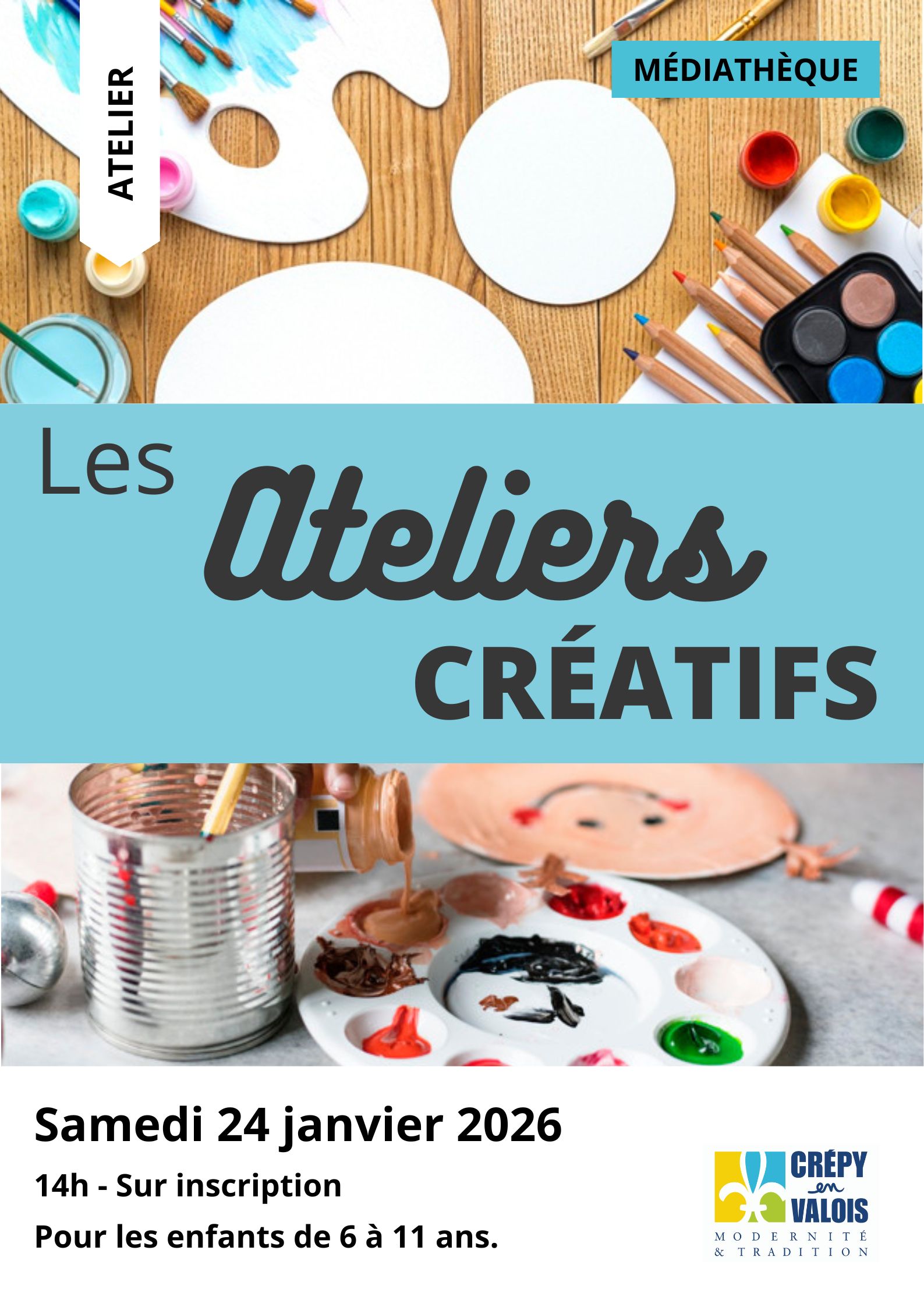 Découvrez nos ateliers aux thèmes variés pour tous Sur inscription - thème à découvrir lors de votre inscription 📆 Samedi 24 janvier 🕑 14h 📍 Médiathèque de Crépy-en-Valois Pour les enfants de 6 à 11 ans