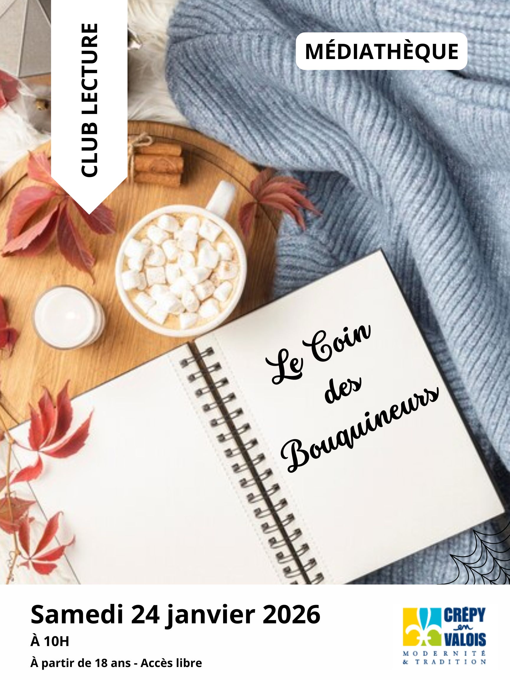 Retrouvons-nous pour un moment convivial afin de partager nos dernières découvertes littéraires. A partir de 18 ans Accès libre 📅 Samedi 24 janvier 🕙 10h 📍 Médiathèque de Crépy-en-Valois