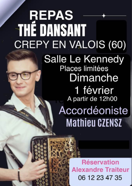 Dans une ambiance festive, profitez d’un moment de détente et de partage autour d’un délicieux repas, suivi d’un après‑midi dansant animé par l’accordéoniste Mathieu Czensz, qui fera vibrer la salle au rythme de son répertoire dynamique et entraînant.