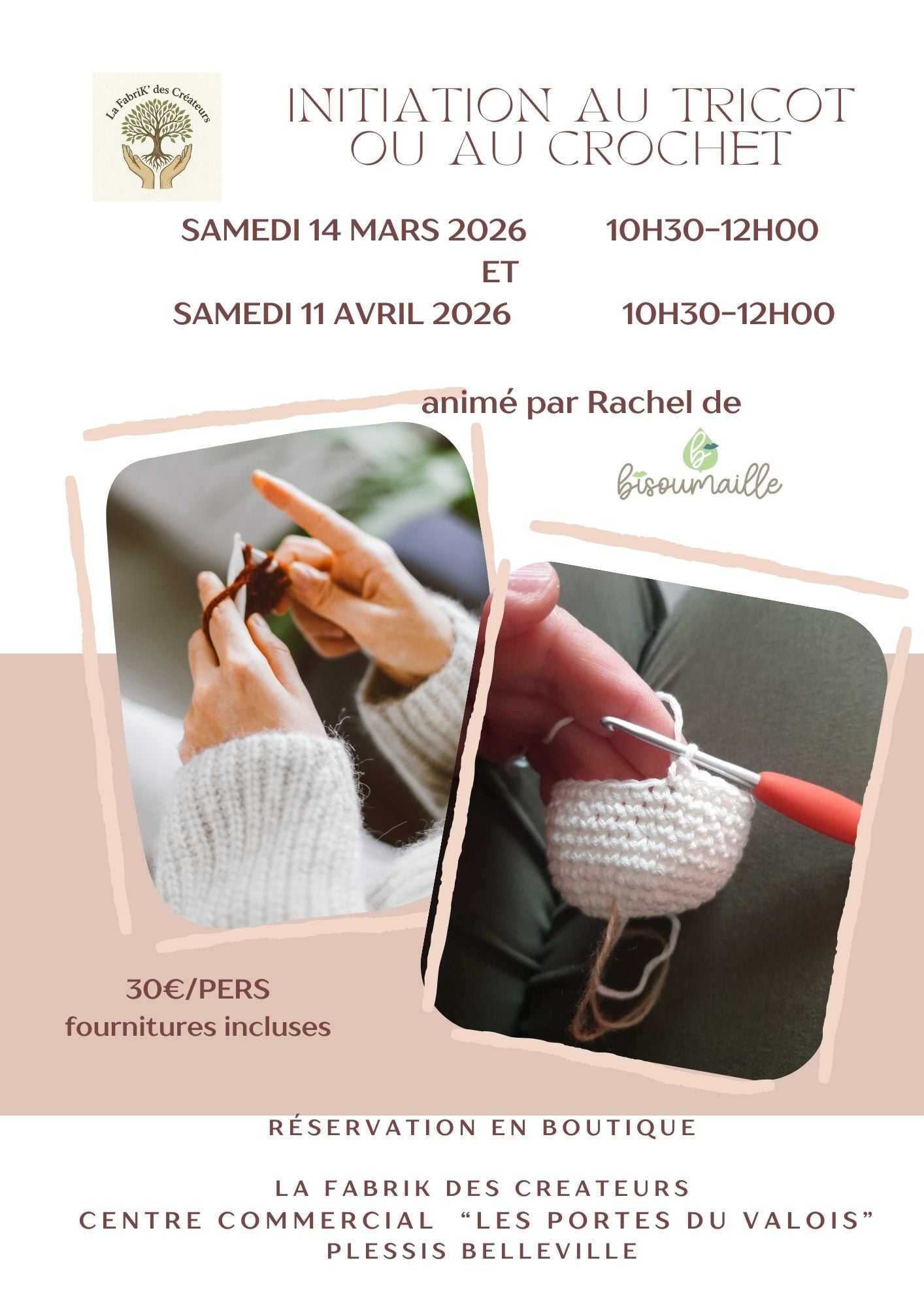 Participez aux ateliers d’initiation au tricot ou au crochet, animés par Rachel de Bisoumaille.