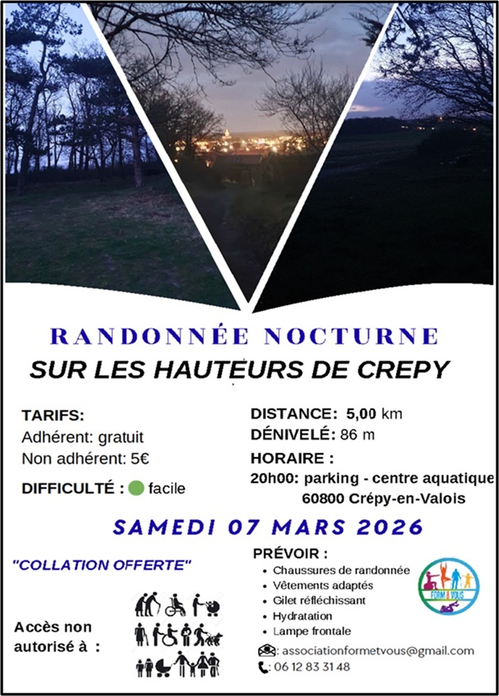 Ne manquez pas la randonnée nocturne sur les hauteurs de Crépy-en-Valois proposée par l’association Form’et Vous, samedi 7 mars 2026.