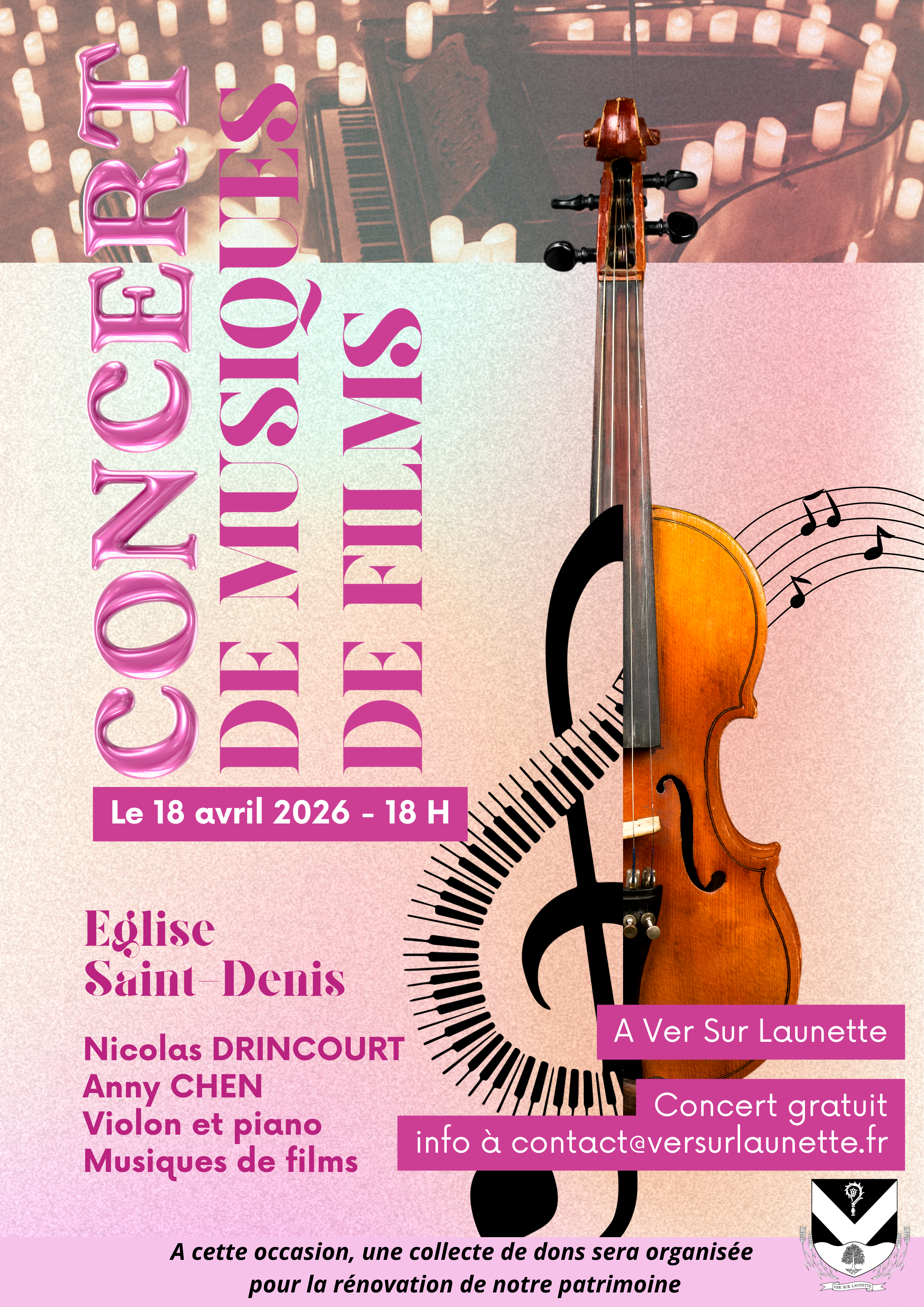 Dans le cadre enchanteur de l’église Saint‑Denis, laissez‑vous transporter par un concert de musiques de films interprétées au violon et au piano par Nicolas Drincourt et Anny Chen.