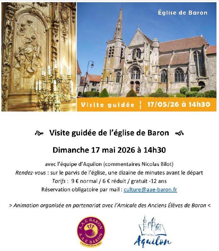 En partenariat avec Aquilon, l'AAE vous propose de participer à une visite commentée de 2h de l'église de Baron au cours de laquelle vous découvrirez l'intérieur et l'extérieur avec un nouveau regard.