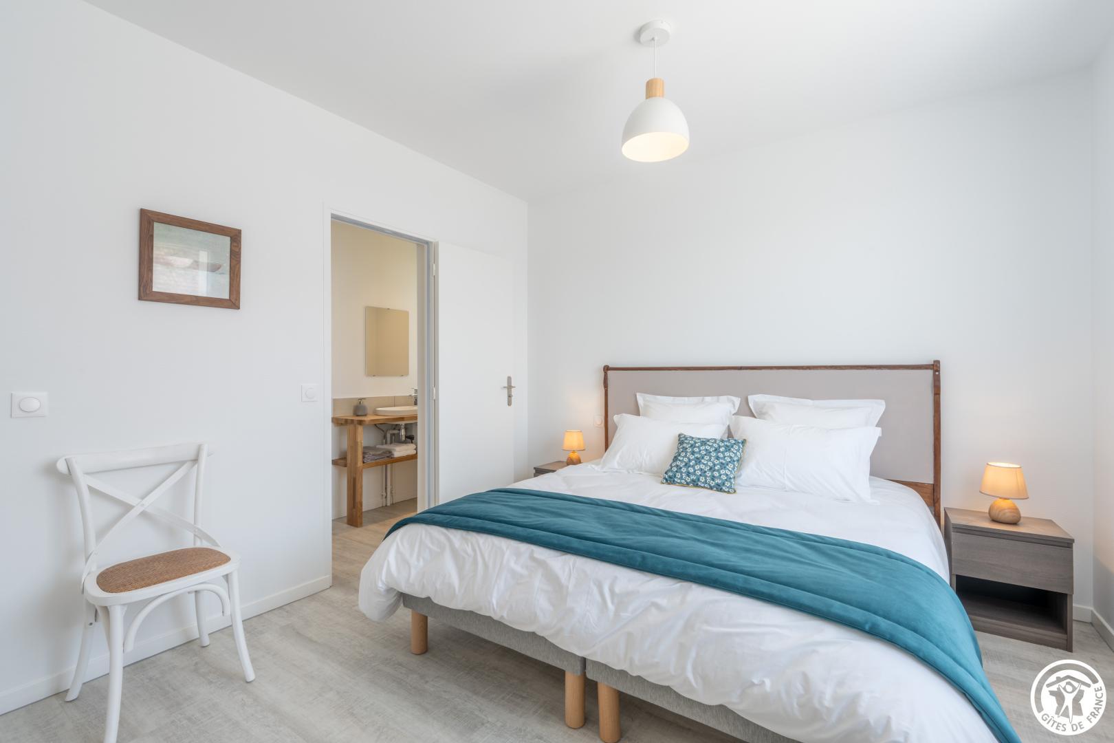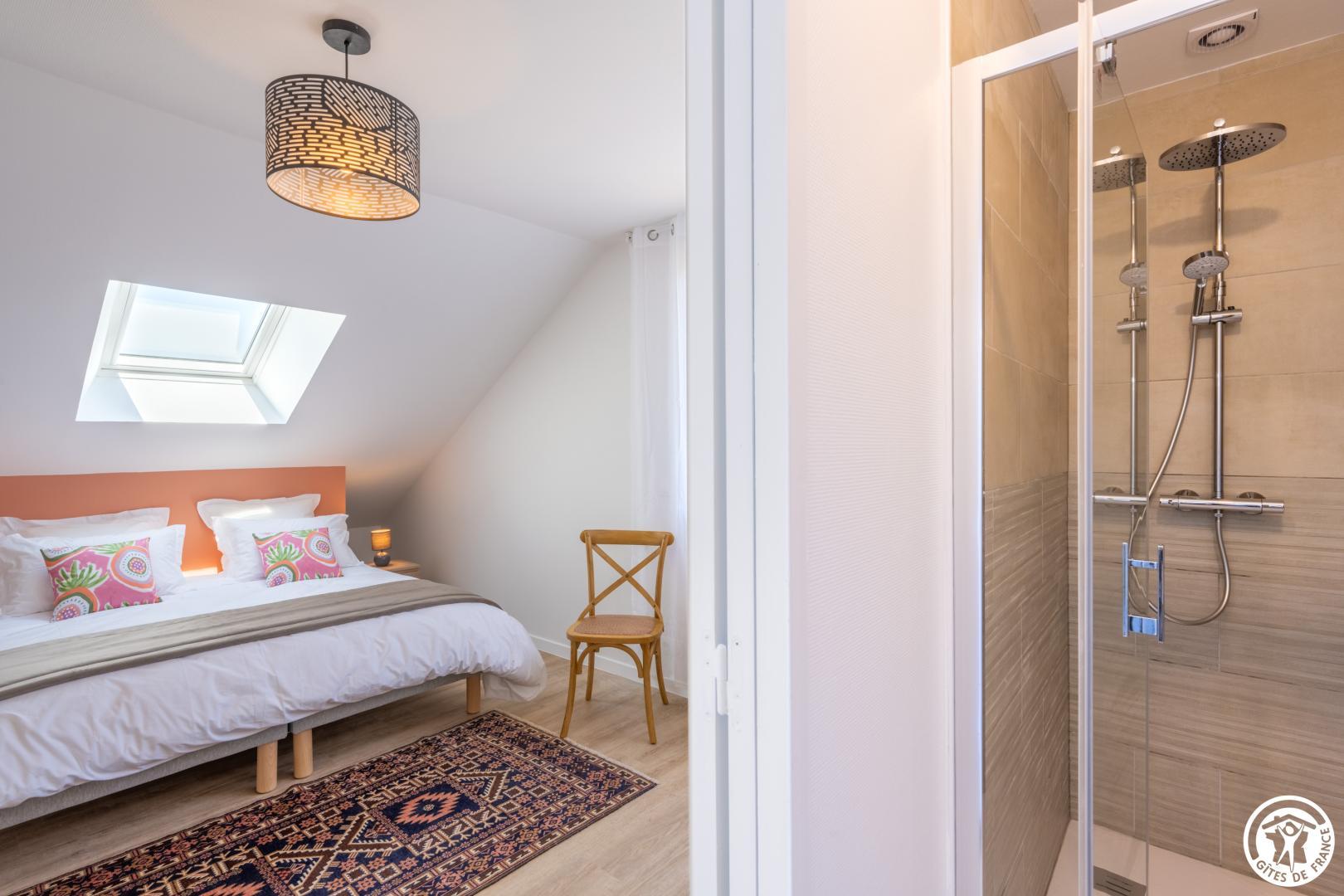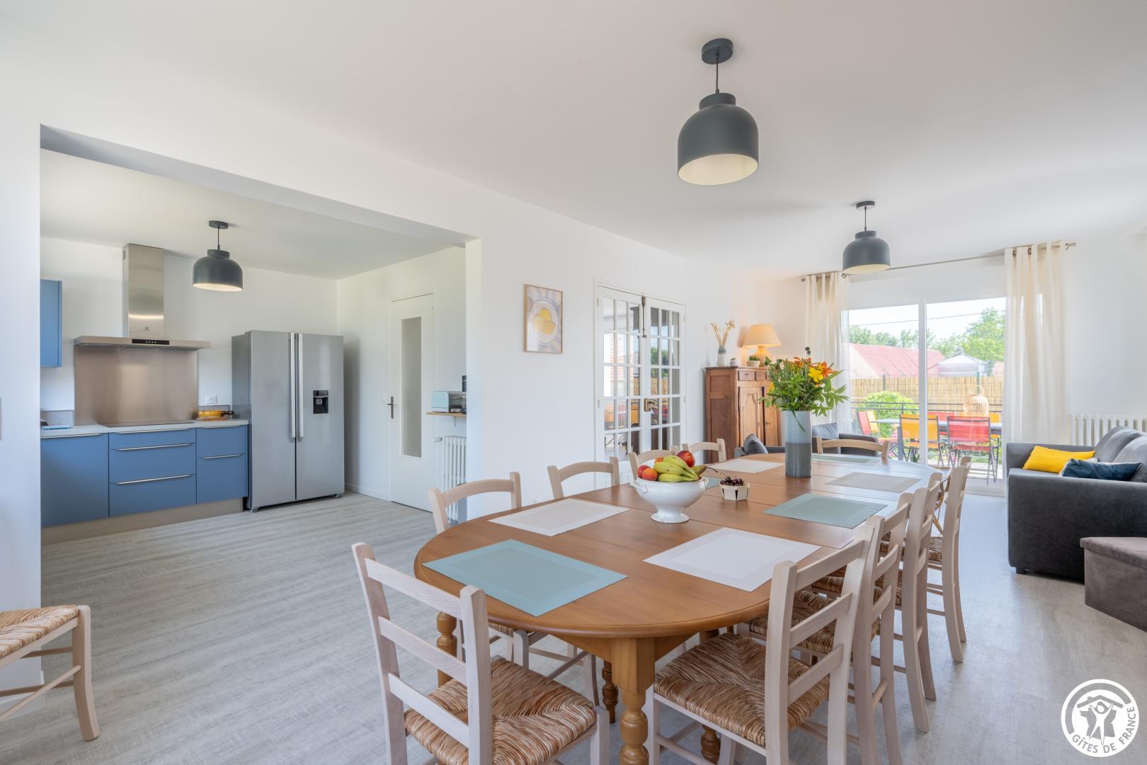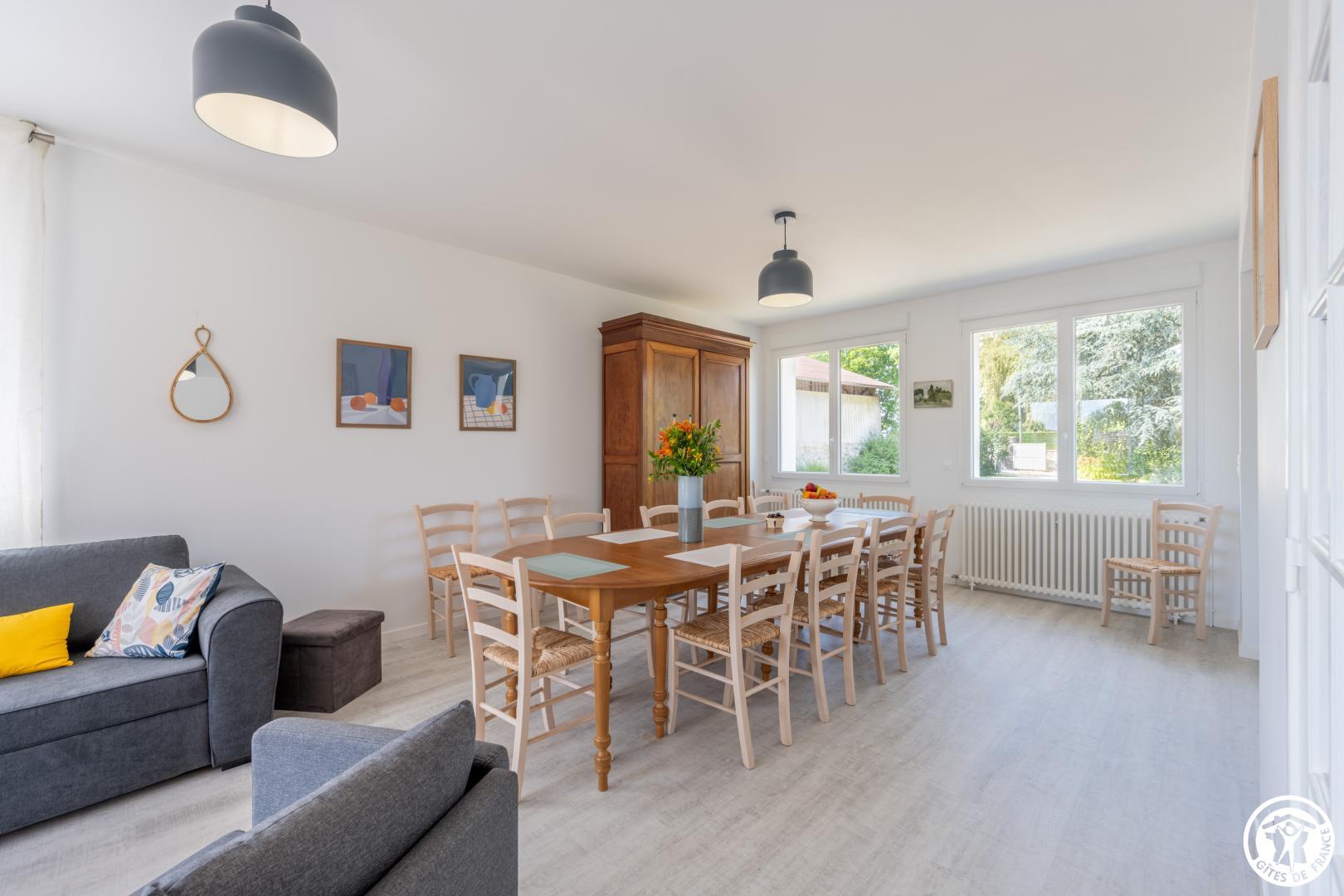 Gite indépendant de 200 m² aménagé sur 2 niveaux pour 12 personnes ( 5 chambres / 12 couchages indépendants). Rez-de-chaussée : Entrée, séjour/ salle à manger donnant sur la terrasse ouverte sur la cuisine équipée (Réfrigérateur / congélateur - lave-vaisselle, micro-onde, plaque à induction, cafetières, salon avec TV (110cm) . 1 chambre pour 2 personnes (2 lits 90x190cm), salle de bain (baignoire + douche) et WC privatif. 2ème chambre (2 lits 90x190cm), salle d'eau privative (douche 98 x87 cm). WC indépendants. Etage : Palier desservant 2 chambres pour 2 personnes (2 lits 90x190 cm) avec salle d'eau privative. 1 chambre pour 4 personnes (4 lits 90x190 cm). Salle d'eau (douche 84x84) et Wc indépendants. Jardin clos de 2000 m² avec salon de jardin, bain de soleil, barbecue. Sous-sol complet avec Lave linge, sèche-linge, baby-foot. Prise de recharge pour véhicule électrique . Tout est compris (lits faits, linge de toilette/ maison , chauffage, électricité). WIFI (fibre).