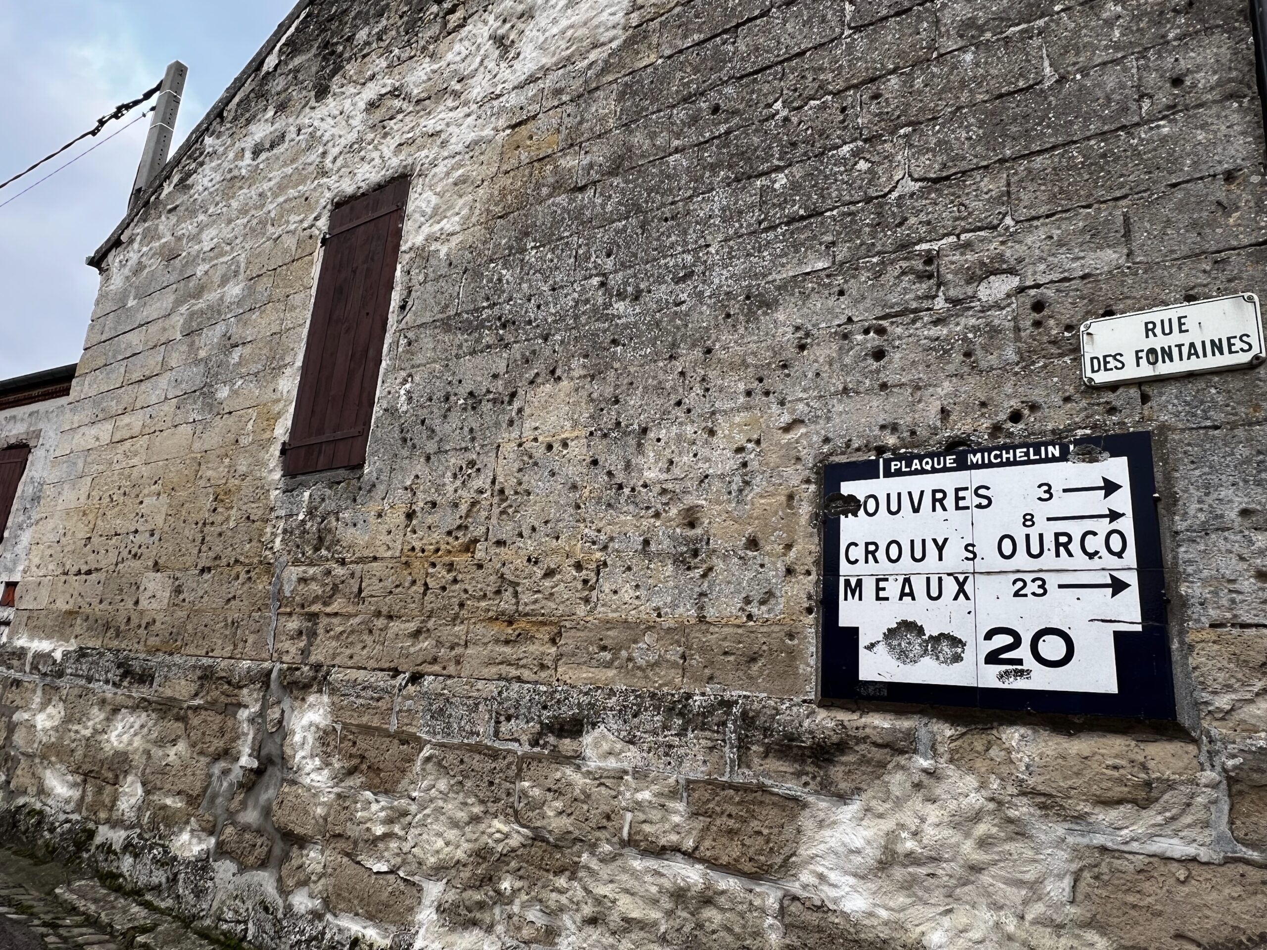 Non loin de l’église, la ferme voisine porte encore les stigmates de la Seconde Guerre mondiale, avec une façade mitraillée, probablement lors de la bataille.