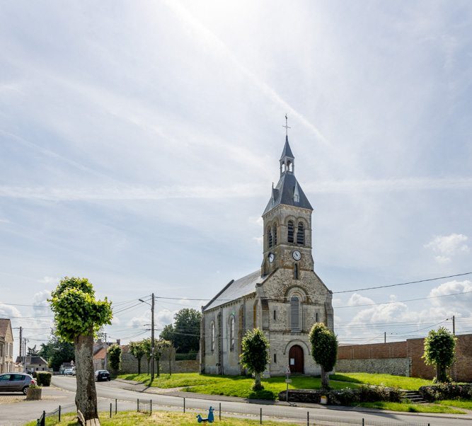 L’église Saint-Martin fut d’abord détruite au XVe siècle, puis reconstruite avant de s’effondrer à nouveau le 30 août 1819. L’édifice actuel, de style néo-roman, est d’une grande sobriété, avec une nef unique de deux travées voûtées en berceau et une abside en cul-de-four. La façade est assez semblable à celle de l’église de Villers-Saint-Genêts, avec un portail central surmonté d’une grande fenêtre, entourée de quatre petites baies. Le clocher-porche, élancé et surmonté d’un clocheton à quatre fenêtres pyramidales, confère une allure élancée à l’ensemble.