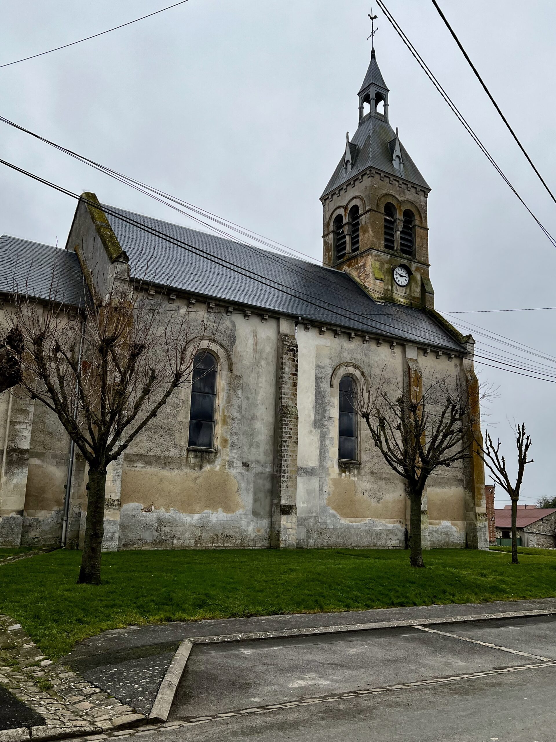 L’église Saint-Martin fut d’abord détruite au XVe siècle, puis reconstruite avant de s’effondrer à nouveau le 30 août 1819. L’édifice actuel, de style néo-roman, est d’une grande sobriété, avec une nef unique de deux travées voûtées en berceau et une abside en cul-de-four. La façade est assez semblable à celle de l’église de Villers-Saint-Genêts, avec un portail central surmonté d’une grande fenêtre, entourée de quatre petites baies. Le clocher-porche, élancé et surmonté d’un clocheton à quatre fenêtres pyramidales, confère une allure élancée à l’ensemble.