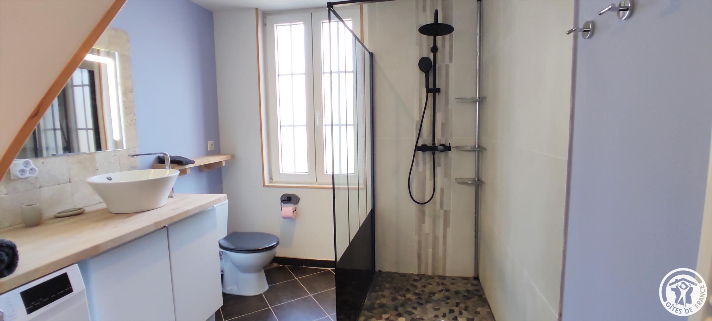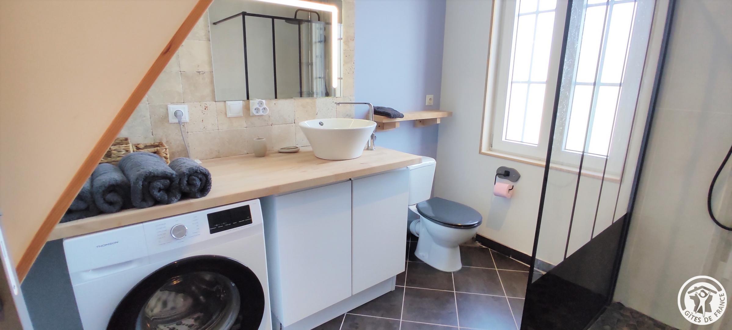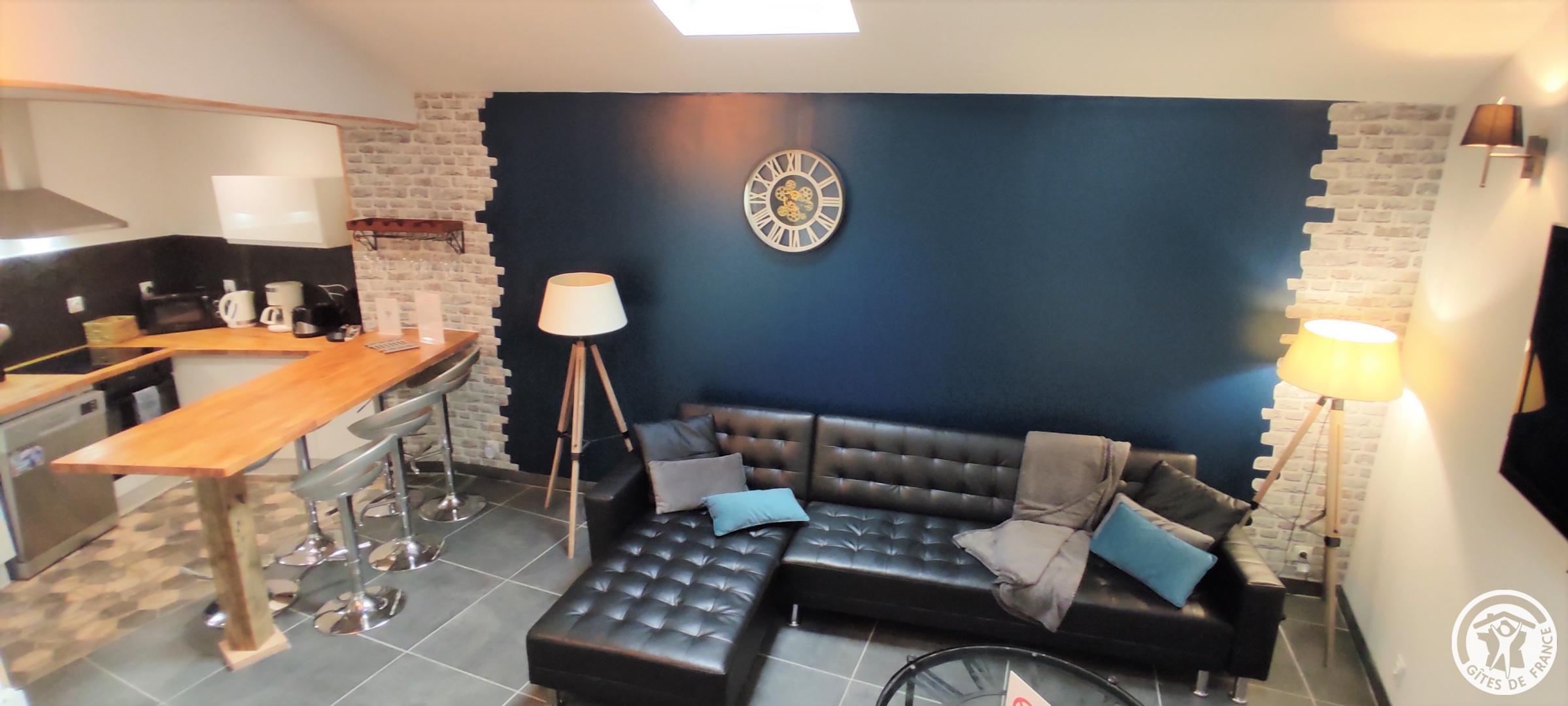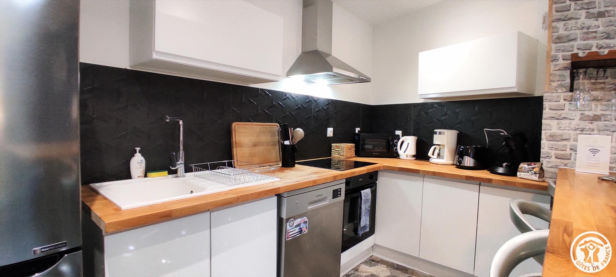 Maison de ville de 50m² rénovée avec gout , spacieuse, elle est aménagée sur 2 niveaux et peut accueillir 4 personnes (possibilité 4 couchages individuels). Entrée par le garage pour accéder au rez de chaussée du gite : Entrée, séjour, cuisine avec table bar, canapé d'angle, grande TV (138 cm), cuisine ouverte et totalement équipée (lave vaisselle, plaque cuisson, hotte, four, micro-ondes, grille pain, cafetière, bouilloire, vaisselle en quantité etc... ), WC et placard sous l'escalier. Luminosité via un puit de lumière 1er étage : Coin lecture, 2 chambres ( lit de 160X200 chacune), salle d'eau avec douche à l'italienne (1.20 x 0.80), lave-linge & WC. Coin nuit en mezzanine accessible par un escalier pentu disposant de 2 lits (80x190cm), Velux. Les draps et le linge de toilette (1 drap de bain + 1 serviette + 1 tapis de bain + 1 essuie-main), des chaussons sont à votre disposition. Tout est compris sauf le ménage de fin de séjour.