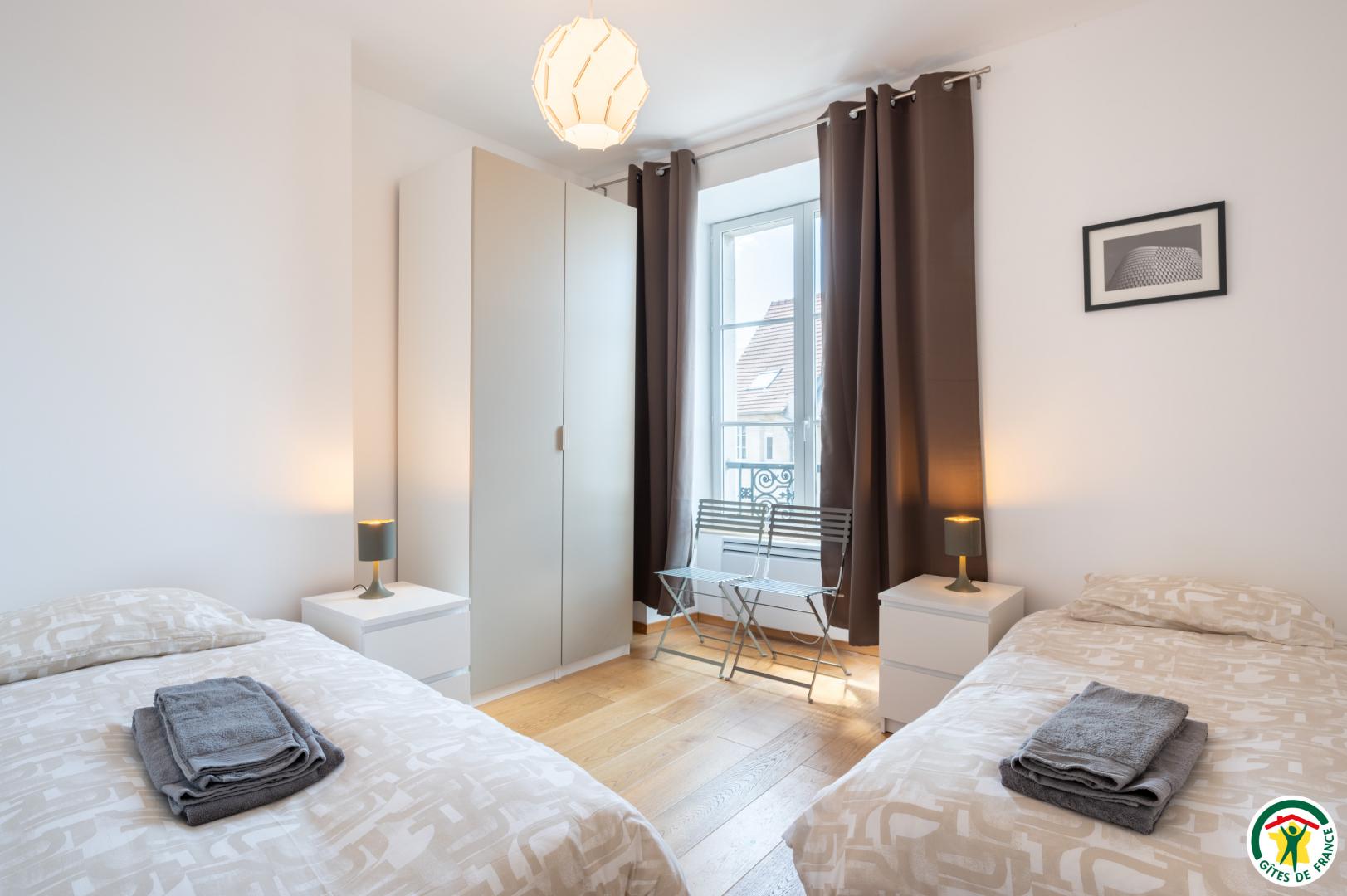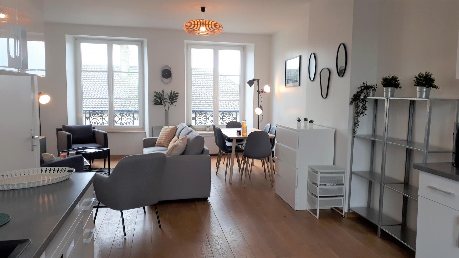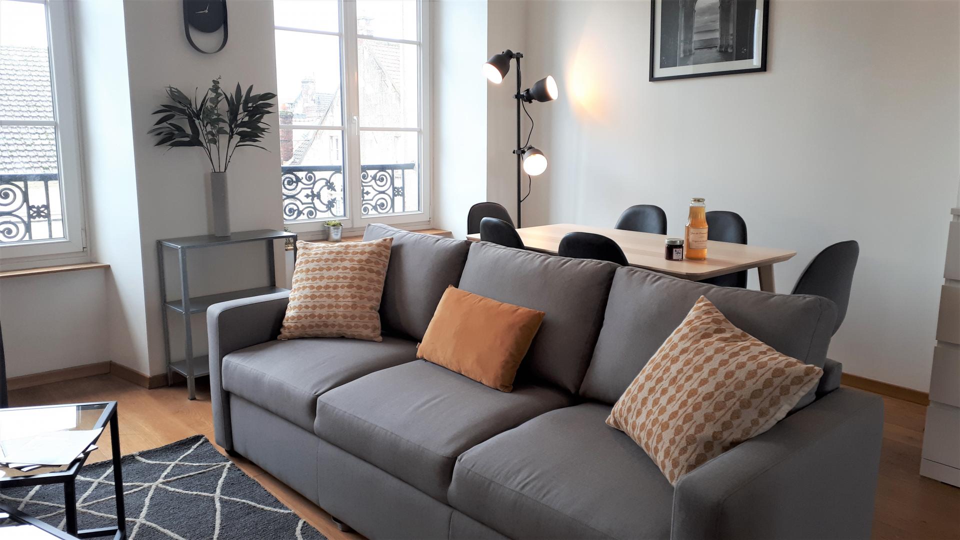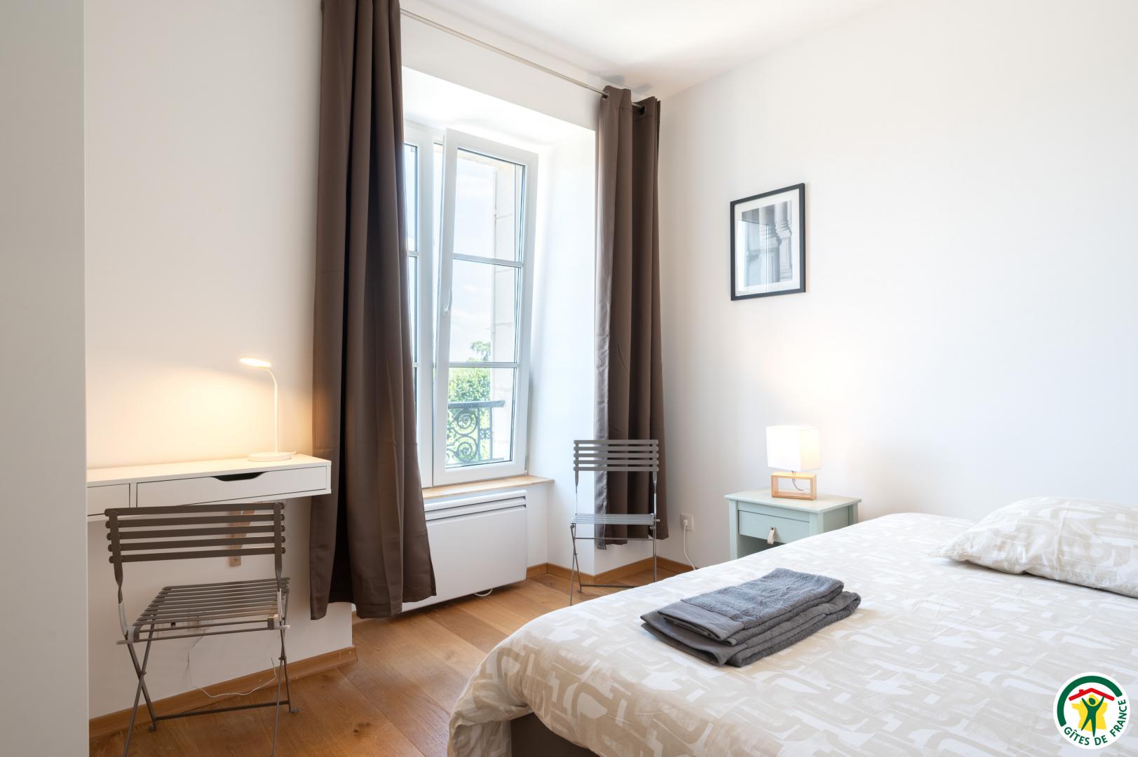 Appartement de 90 m² , pour 6 personnes, rénové avec goût, au 2d étage (sans ascenseur). Il est composé d'un séjour / salon très lumineux sans vis-à-vis avec TV, ouvert sur une cuisine très bien équipée (Lave-vaisselle, Lave-linge/Sèche-linge, four, micro-ondes, réfrigérateur/congélateur, cafetière avec dosette), de 3 chambres pouvant accueillir 2 personnes chacune (1 lit 140x190 cm / 2 lits 90x200 cm / 2 lits 90x200 cm + 120x200 cm ). Salle de bain équipée d'une baignoire avec douchette, d'un meuble vasque et 1 WC indépendant avec lave mains. Terrasse privative, avec salon de jardin et barbecue. Place de parking dans la cour fermée de la résidence. Pour votre confort, le linge de maison, les serviettes de toilette, les draps sont compris dans le prix. Le ménage de fin de séjour est en supplément. Connexion en WIFI.