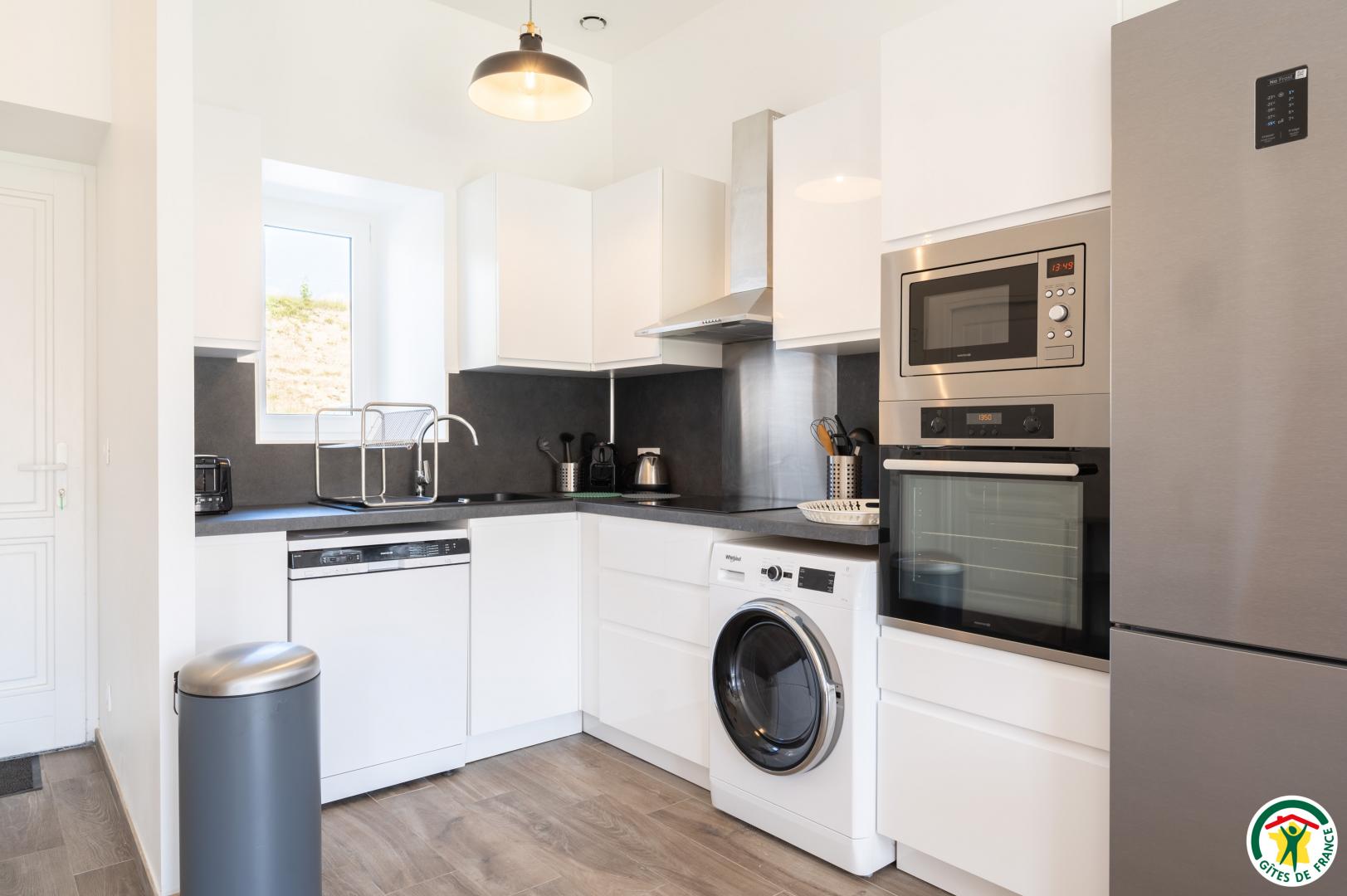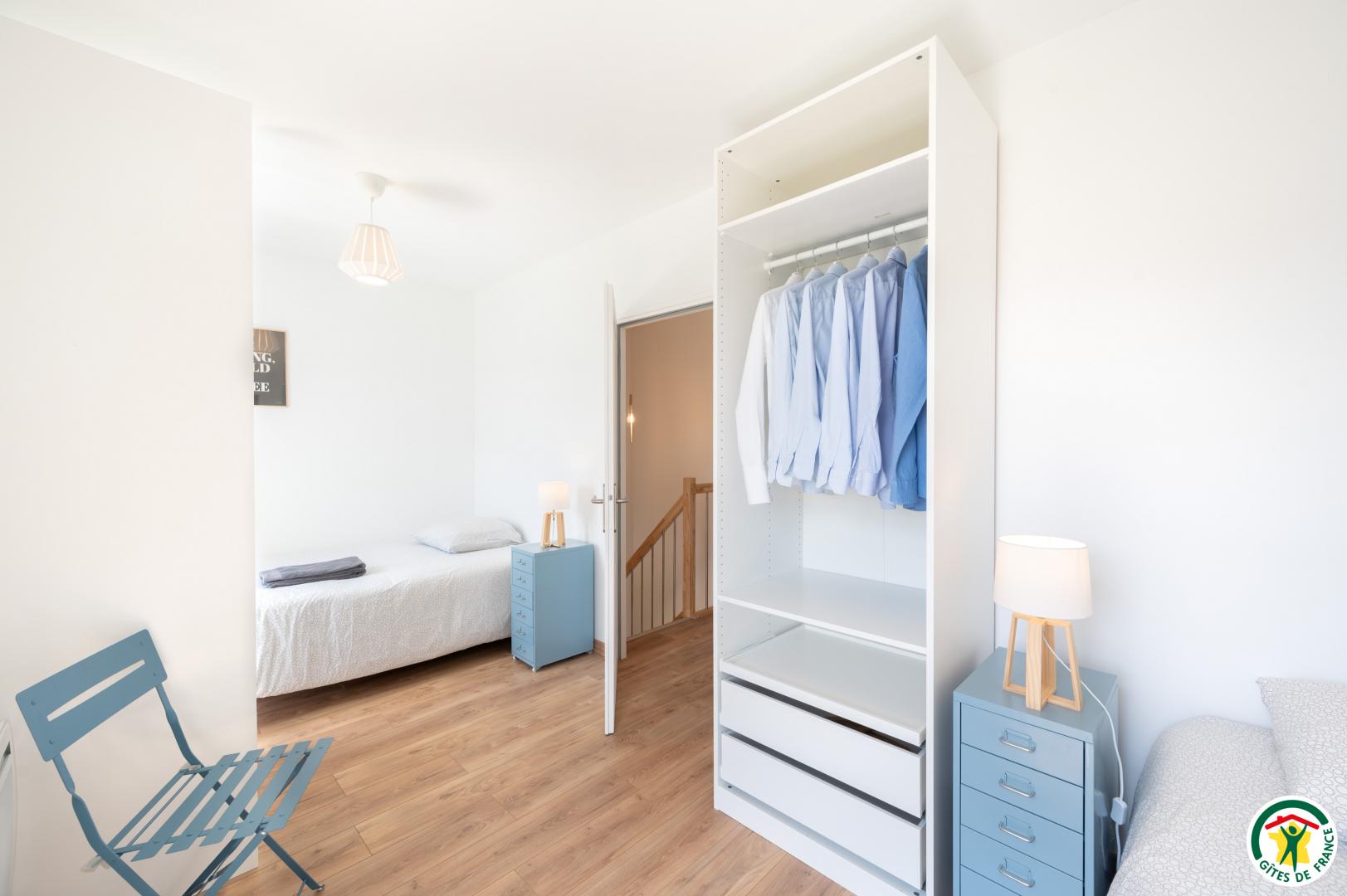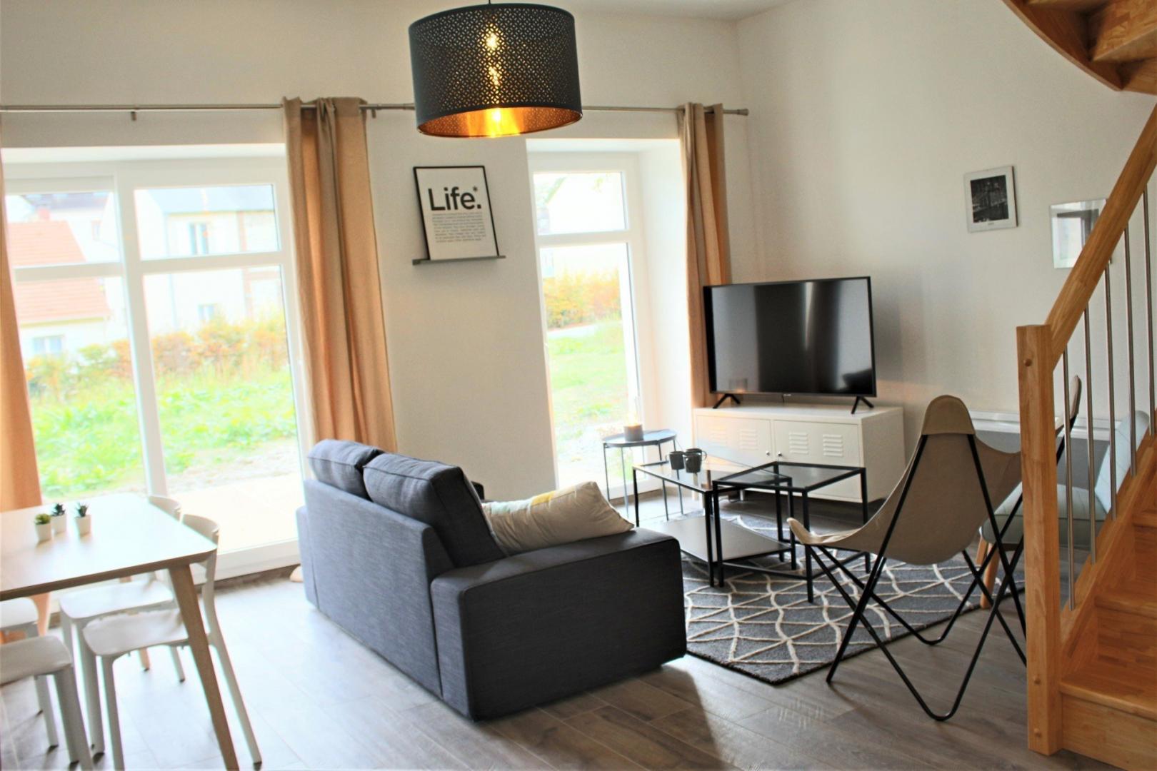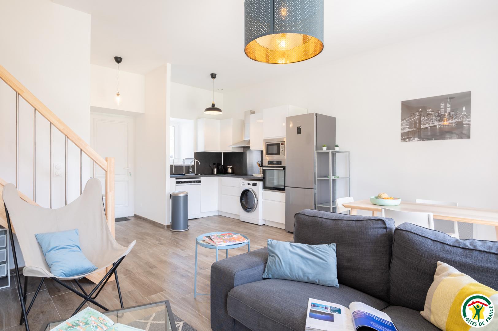 Ce gite de 70m² aménagé sur 2 niveaux est meublé et décoré avec goût. Cette maison peut accueillir jusque 4 personnes. Il est composé : - Au rez-de-chaussée : d'un agréable séjour ouvert et lumineux composé d'un espace salon avec télévision, d'une cuisine entièrement équipée (Lave-vaisselle, Lave-linge / Sèche-Linge, Four, Micro-ondes, Réfrigérateur/Congélateur, Cafetière avec dosette) et d'une salle d'eau avec WC. - A l'étage : 3 chambres (2 chambres avec chacune 1 lit de 120x200cm et 1 chambre équipée avec 2 lits de 90x190cm) et 1 salle d'eau avec WC. Ce logement s'agrémente également d'un jardin privatif avec terrasse et salon de jardin. Le stationnement se fait sur le parking commun à tous les logements, vous disposez de deux places de parking privative. Le gite est équipé d'une connexion internet en WIFI.