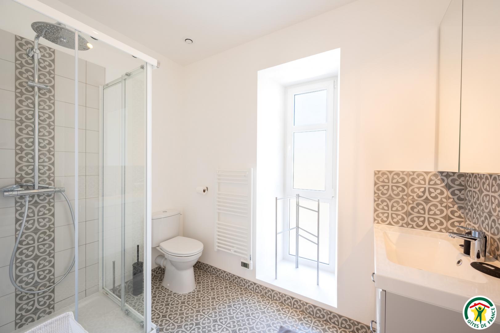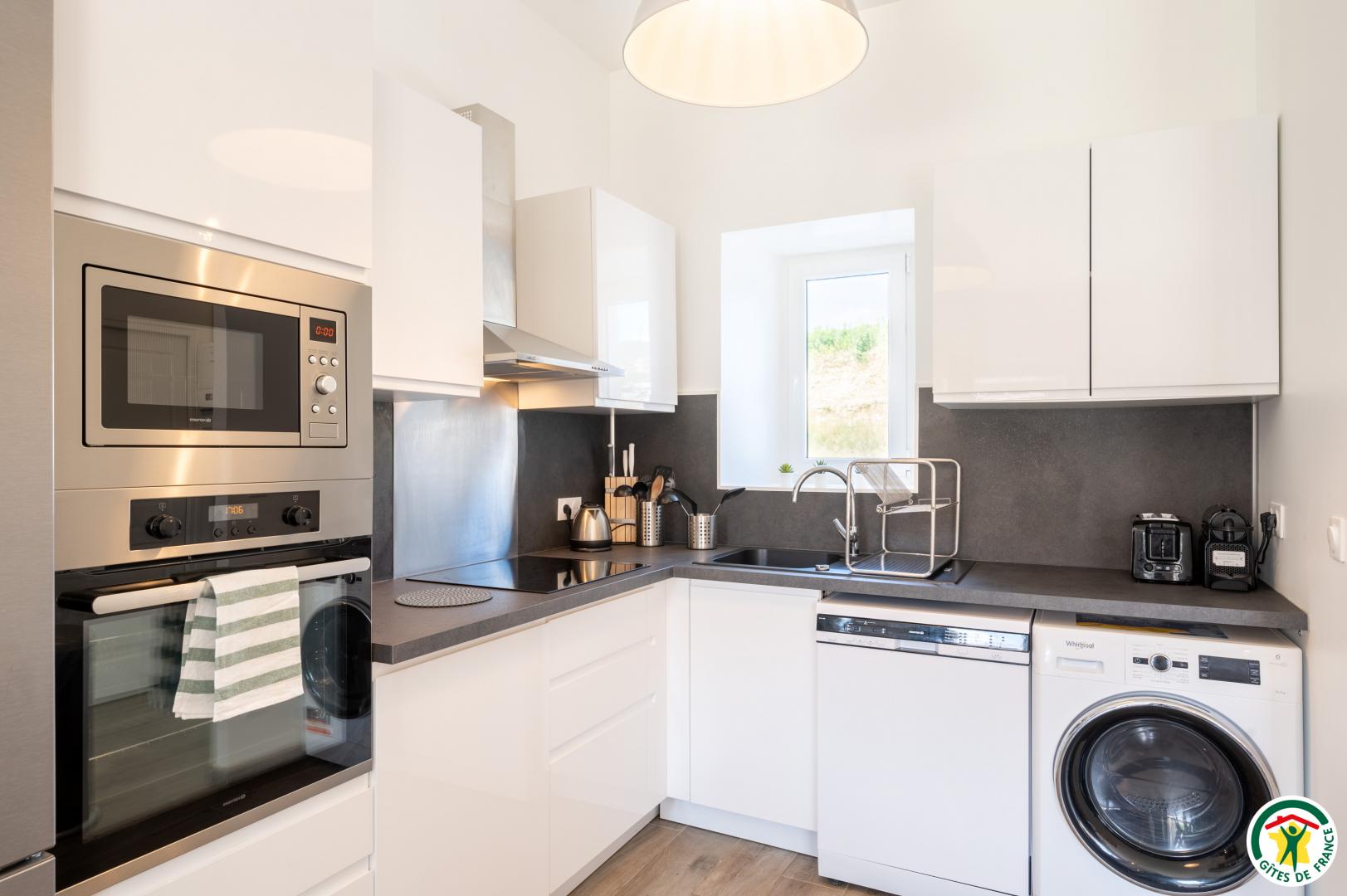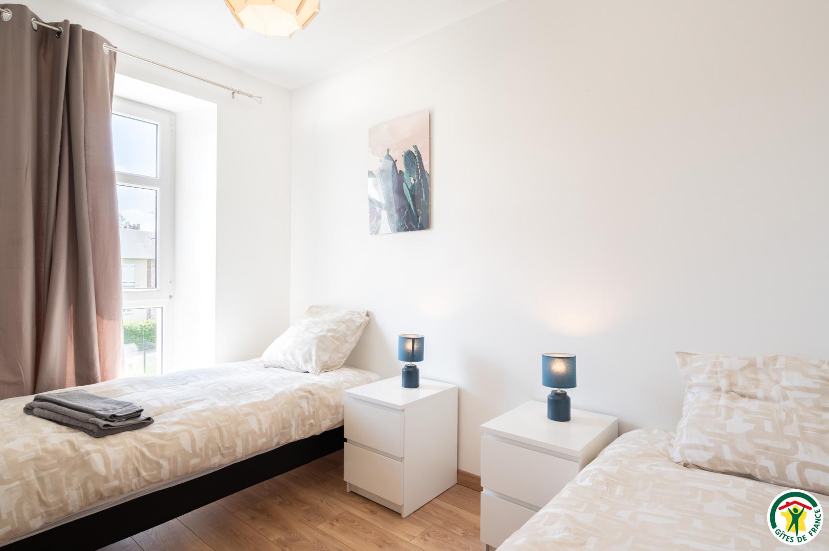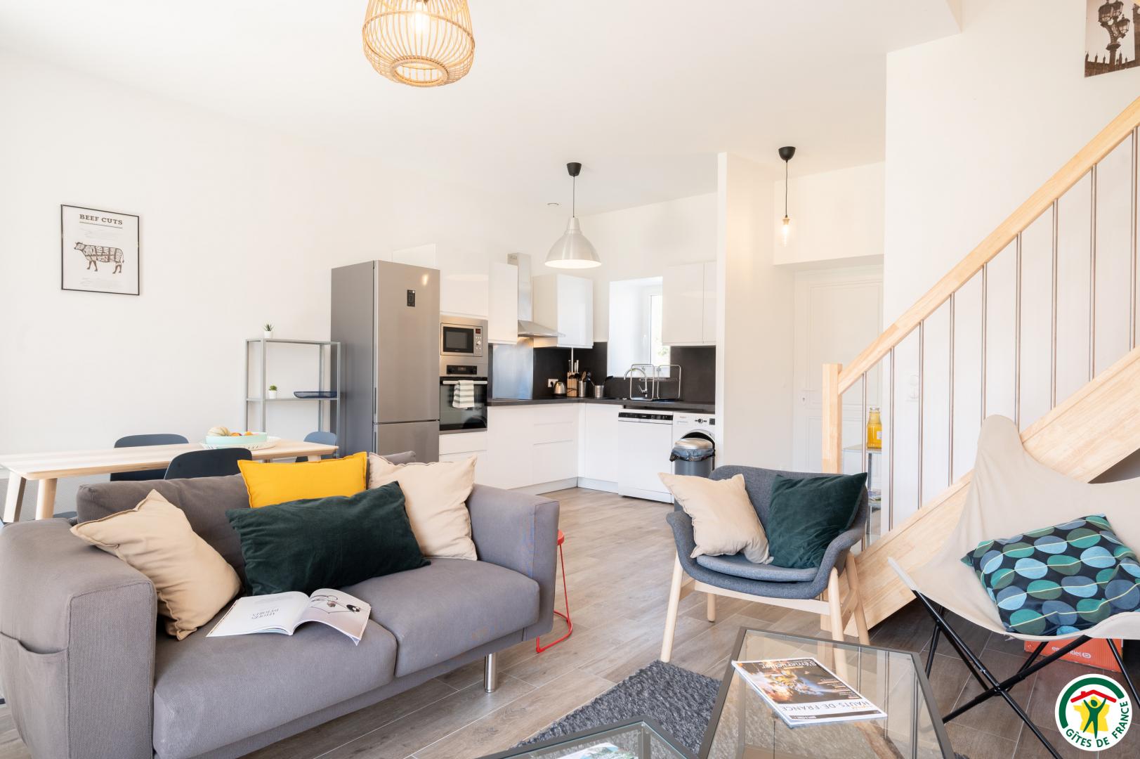 Ce gite de 70m² aménagé sur 2 niveaux est meublé et décoré avec goût. Cette maison peut accueillir jusque 4 personnes. Il est composé : - Au rez-de-chaussée : d'un agréable séjour ouvert et lumineux composé d'un espace salon avec télévision, d'une cuisine entièrement équipée (Lave-vaisselle, Lave-linge / Sèche-Linge, Four, Micro-ondes, Réfrigérateur/Congélateur, Cafetière avec dosette) et d'une salle d'eau avec WC . - A l'étage : 2 chambres (4 lits de 90x190 cm) et 1 salle d'eau avec WC. Ce logement s'agrémente également d'un jardin privatif avec terrasse. Le stationnement se fait sur le parking commun à tous les logements, vous disposez de deux places de parking privative. Pour votre confort, le linge de maison, les serviettes de toilette, les draps sont compris dans la prestation. Un relevé de compteur sera effectué pour le règlement des charges électriques. Le ménage de fin de séjour est en supplément (100€). Le gite est équipé d'une connexion internet en WIFI.