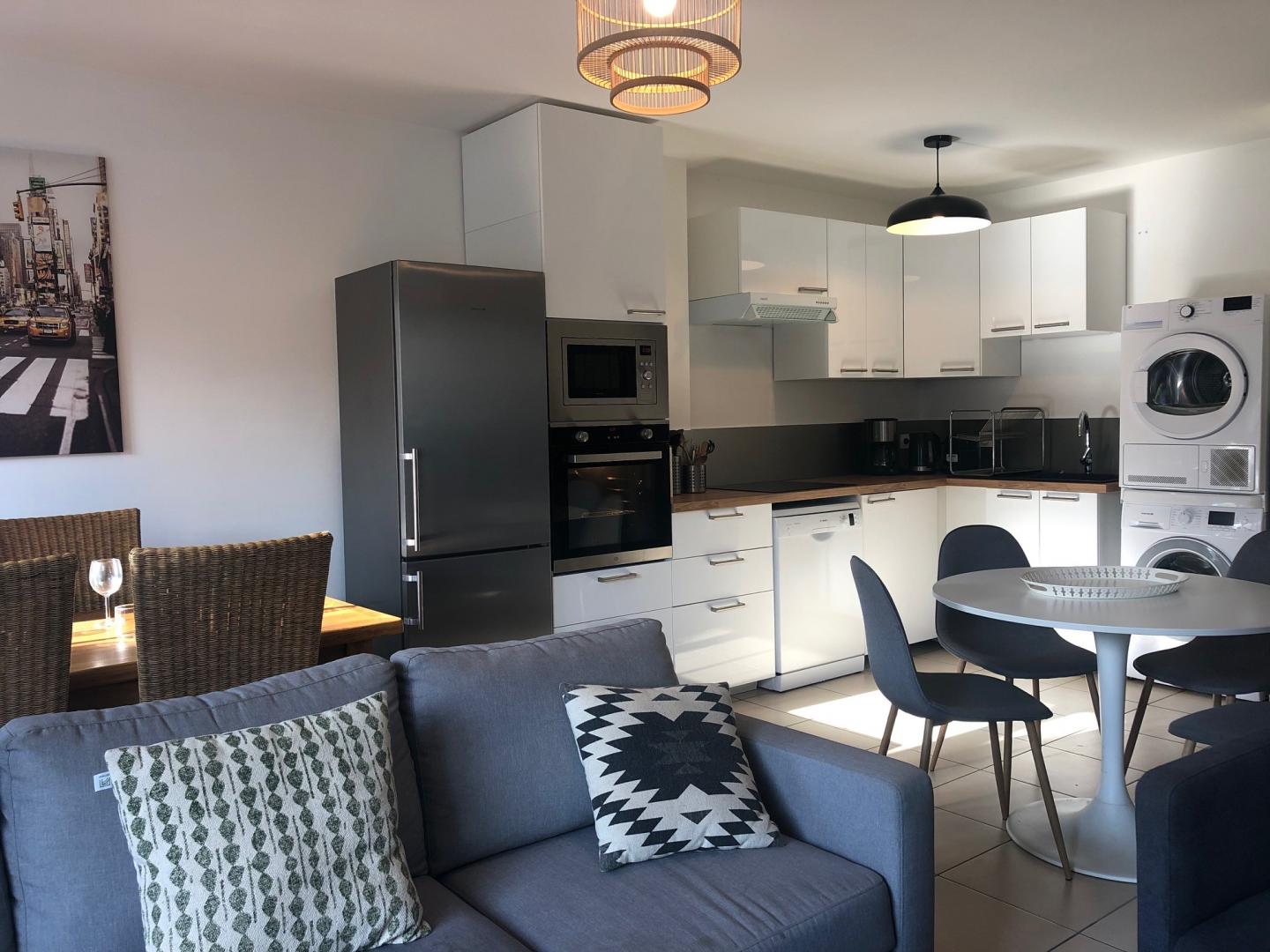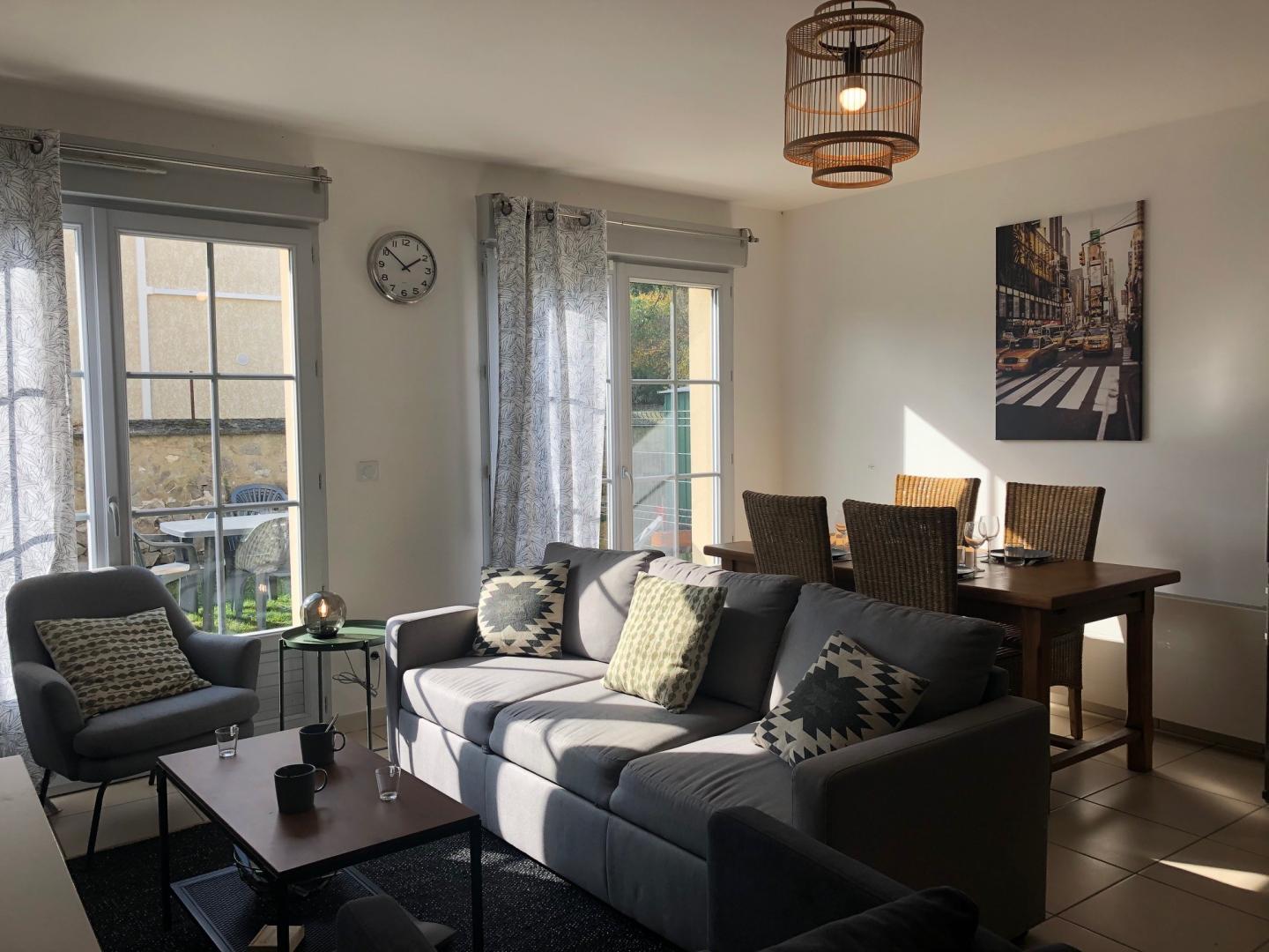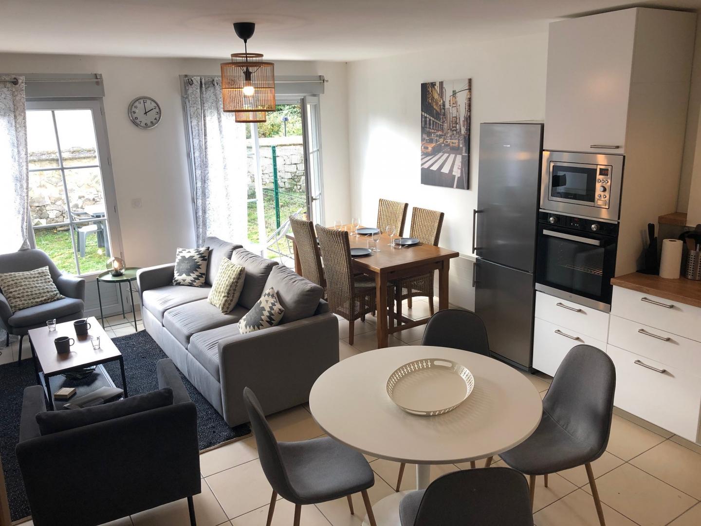 Ce gite de 88 m² rénové avec goût peut accueillir jusque 6 personnes. Il est aménagé sur 3 niveaux, dispose de 4 chambres, 2 salles de bains et 2 wc. Au rez-de-chaussée, il est composé d'un grand séjour/salon avec TV, ouvert sur une cuisine équipée (micro-ondes - four - réfrigérateur - lave vaisselle - lave linge et sèche linge, cafetière, bouilloire....), d'une salle d'eau (douche), lave -mains et Wc. Au 1er étage : 2 chambres pour 2 personnes (2 lits 90x200 cm) chacune - Une salle de bain (baignoire), vasque, Wc. 2ème étage (sous comble) : 2 chambres pour 1 personne chacune (1 lit 120x190 cm + 1 lit 90x200 cm). Connexion internet en Wifi. Jardin, terrasse, salon de jardin, barbecue. Pour votre confort, le linge de maison, les serviettes de toilette, les draps sont compris dans la prestation. Un relevé de compteur sera effectué pour le règlement des charges électriques. Le forfait ménage en fin de séjour de 120 € est à ajouter au prix du séjour