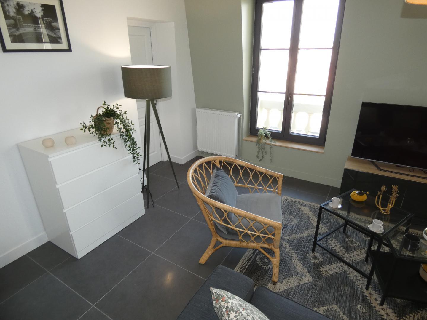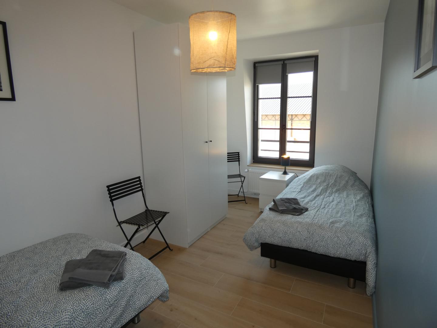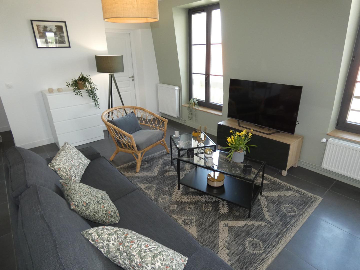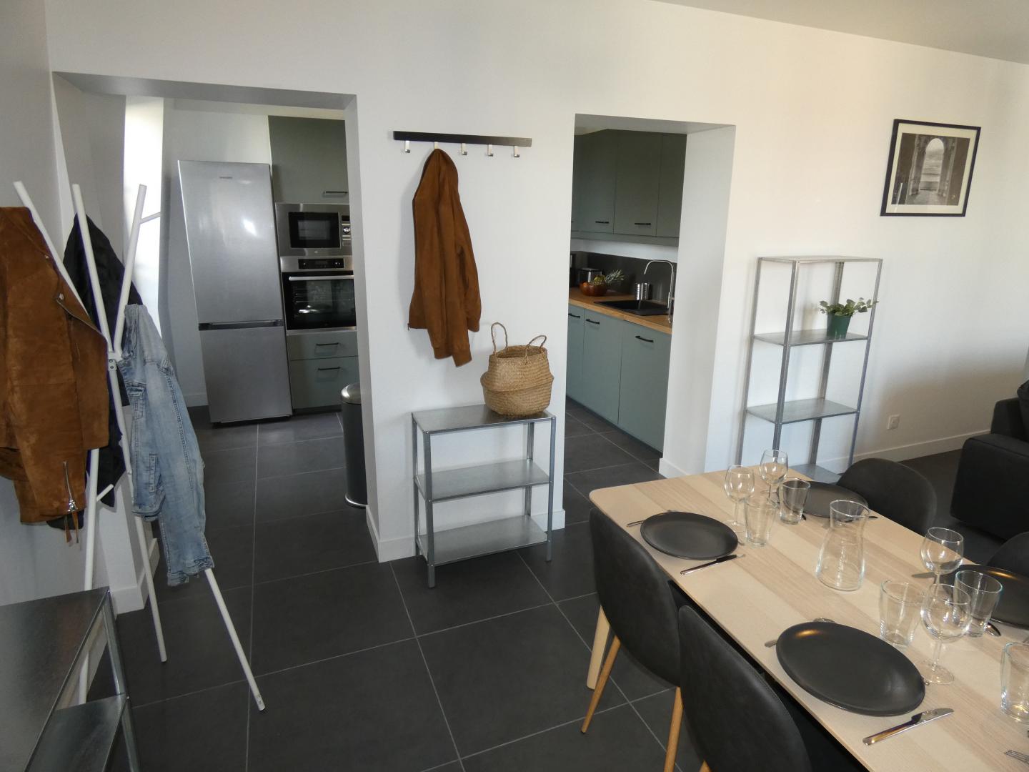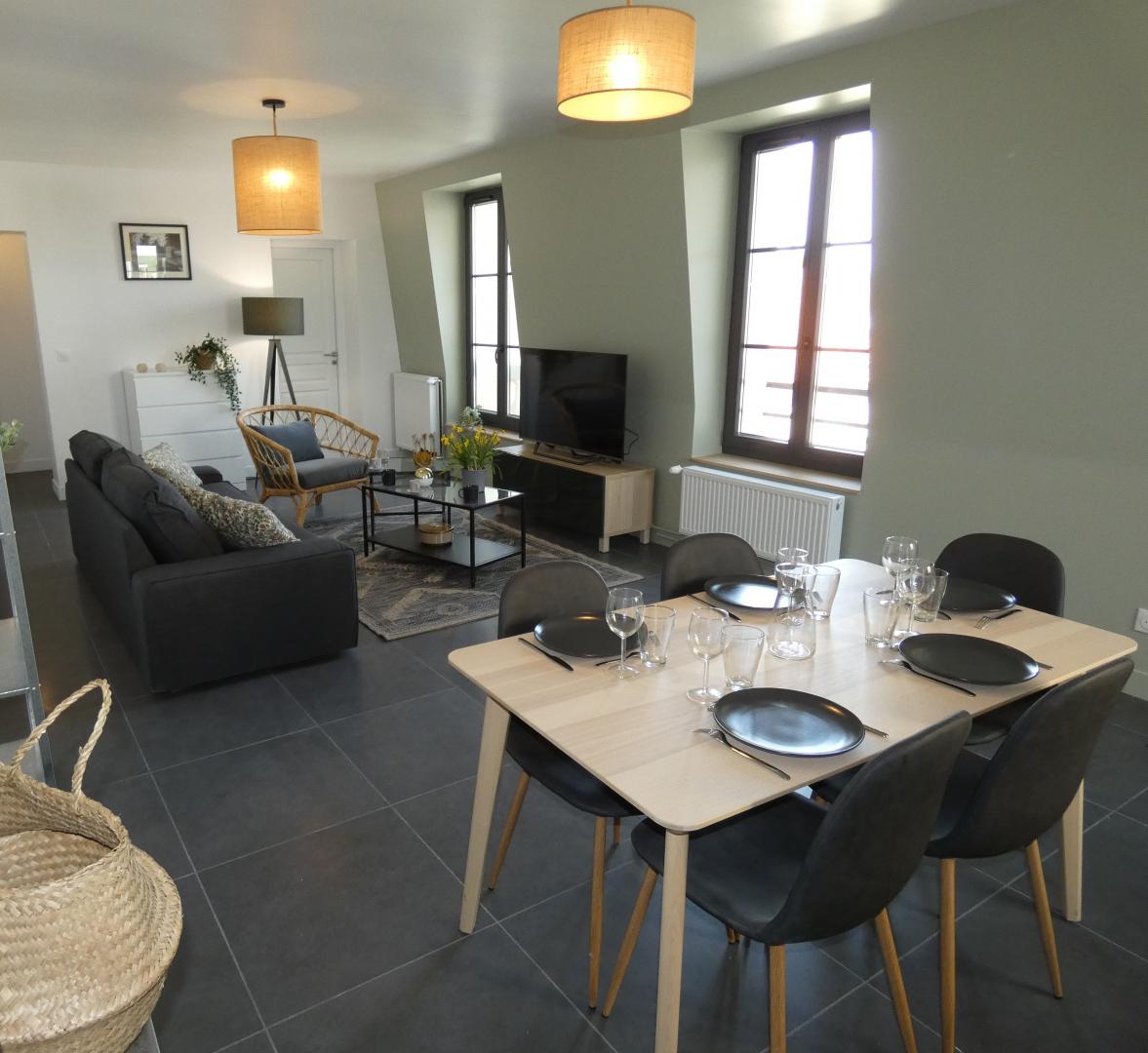 Cet appartement de 93m² a été rénové avec goût peut accueillir jusque 5 personnes . Ce logement situé au 2ème étage d'une résidence comprenant plusieurs gites et dispose de 3 chambres, 2 salles d'eau et 2 WC. Il est composé d'un agréable séjour avec une grande cuisine équipée (micro-ondes - four - réfrigérateur - lave vaisselle - lave linge et sèche linge, cafetière, bouilloire....), de 3 chambres (dont 1 chambre individuelle, soit 5 lits au global). Il dispose également d'un jardin partagé ainsi que de grandes places de parking. Connexion internet en Wifi. Pour votre confort, le linge de maison, les serviettes de toilette, les draps et le ménage de fin de séjour sont compris dans la prestation. L'Électricité (relevé de compteur) vous sera facturée en fin de séjour. Ménage fin de séjour en supplément ajouter (120€)